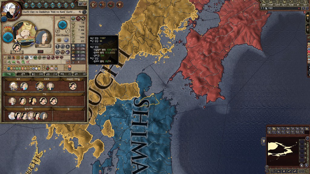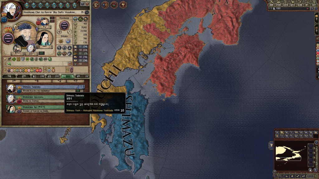 그 사이 아시카가 막부도 확장을 엄청했는데 그 공신인 호소카와가문입니다. 왕 작위가 4개이며 아시카가 쇼군은 허수아비고 실질적인 지배자는 호소카와죠. 그래서 호소카와랑 동맹을 맺고 오우치를 치기로했습니다.