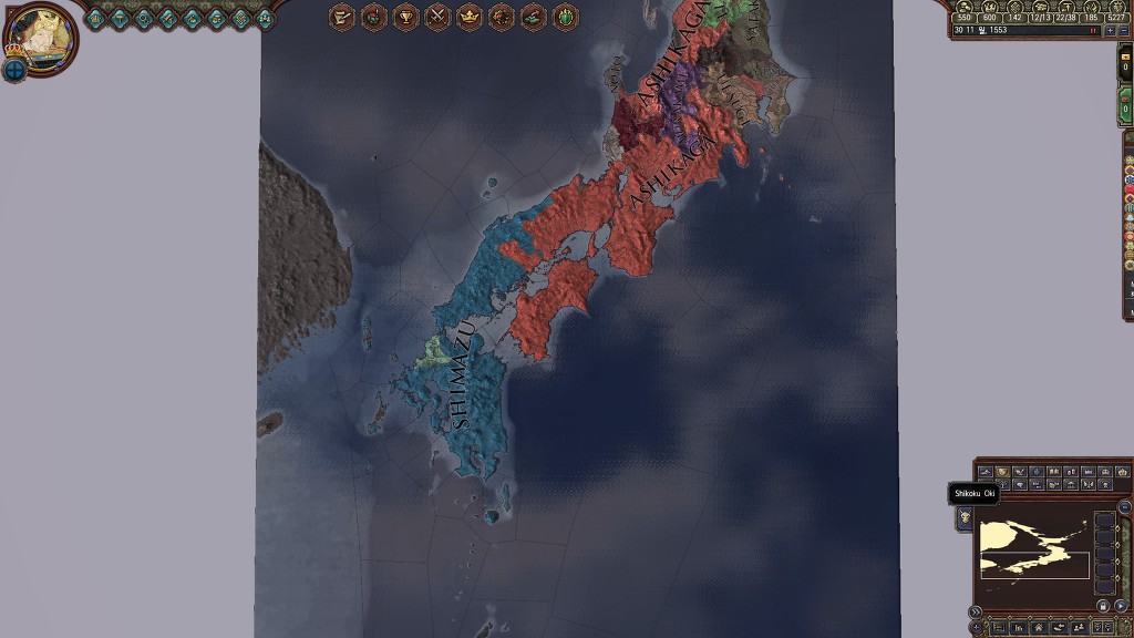 후반 렉이나 팅김을 방지하기 위해 좀 가벼운 모드로 하려고했는데 모드를 찾던 중 일본전국시대 모드가 있더군요. 예전 신장의 야망을 한적이 있어서 왠지 재밌을거같았습니다. 시대는 오닌의 난 이후인 1500년이고 가문은 규슈 지역의 시마즈(임진왜란때 도공 뺏어갔던 걸로 유명한 도진가입니다)로 선택했습니다. 난이도는 보통이었고 강대국보단 약소국을 키워서 대국으로 만들때 크킹이 특히 재미있죠.