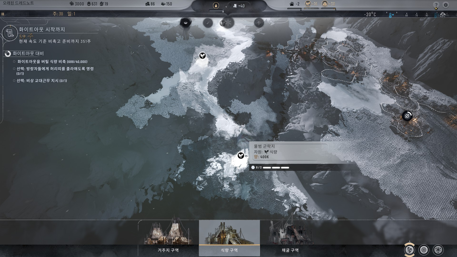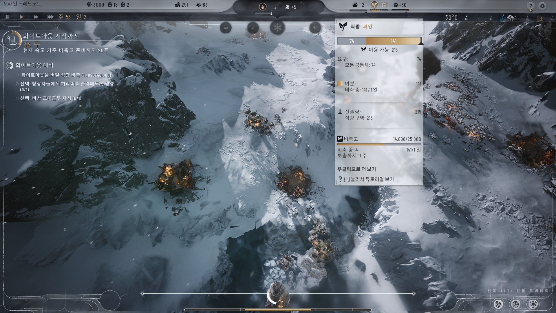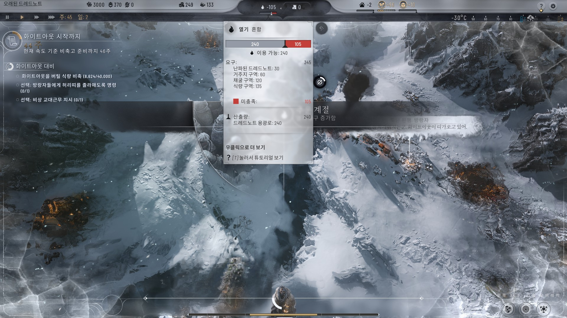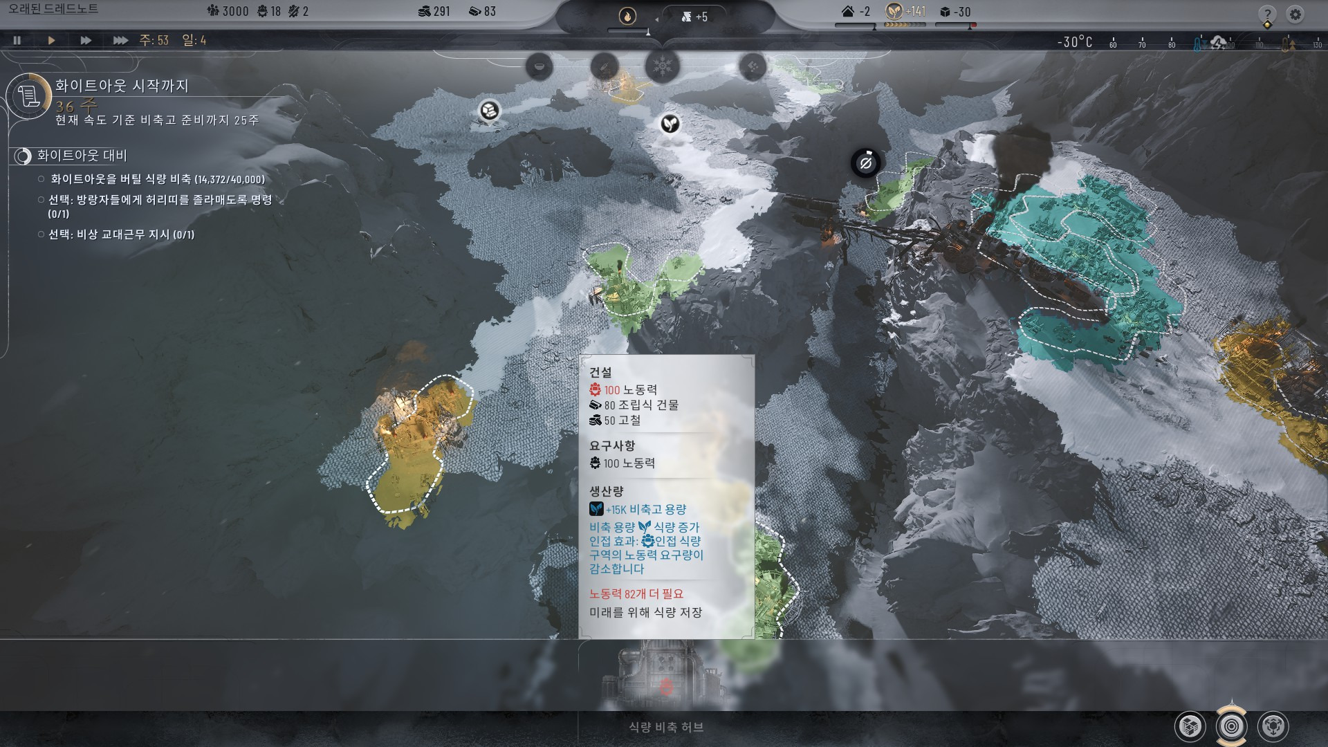 아슬아슬하게 열기 수요를 맞추는 데 성공했고, 식량 생산량도 화이트아웃 이전까지 4만을 모을 수 있을 정도로 늘어났습니다만,