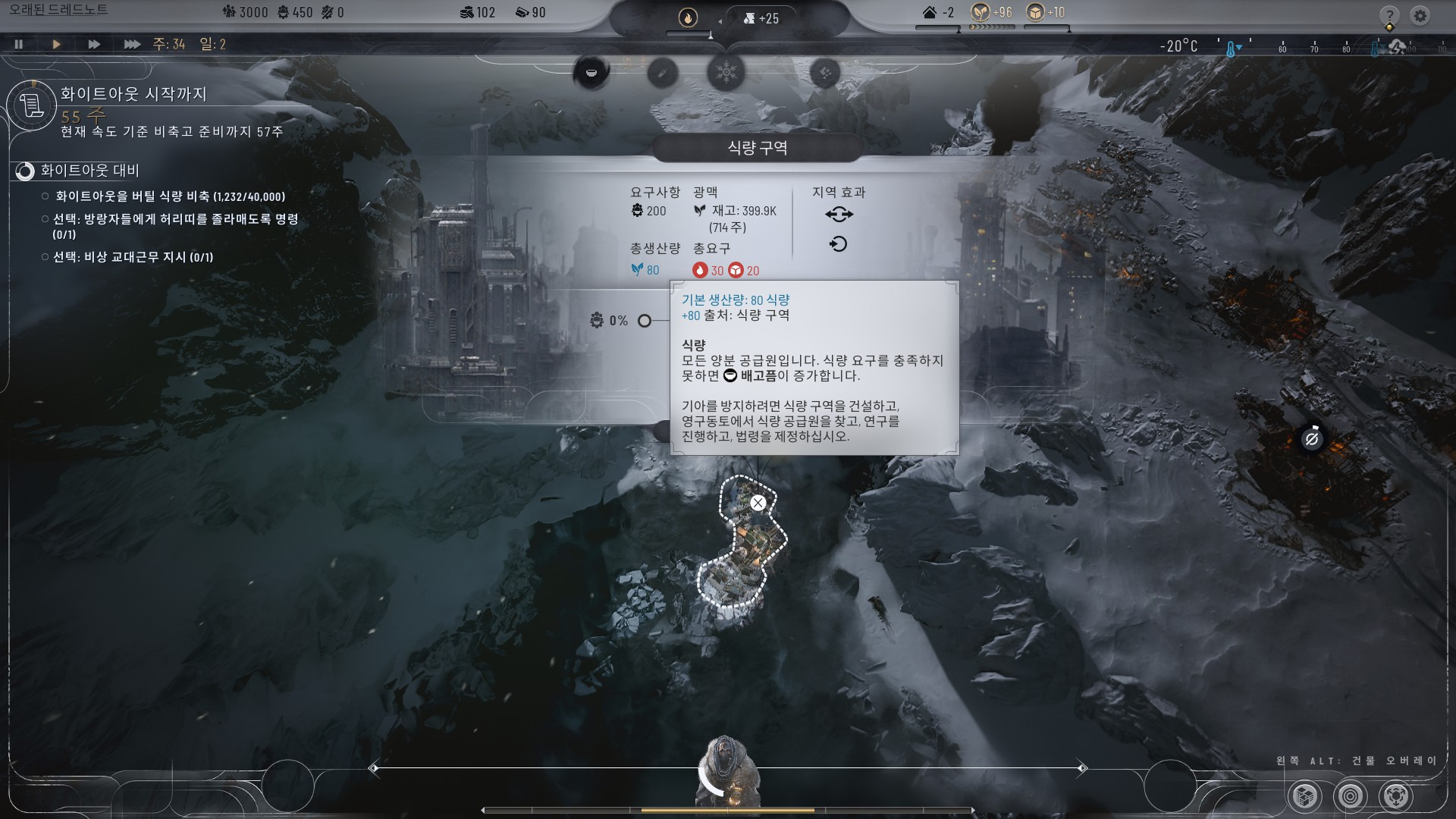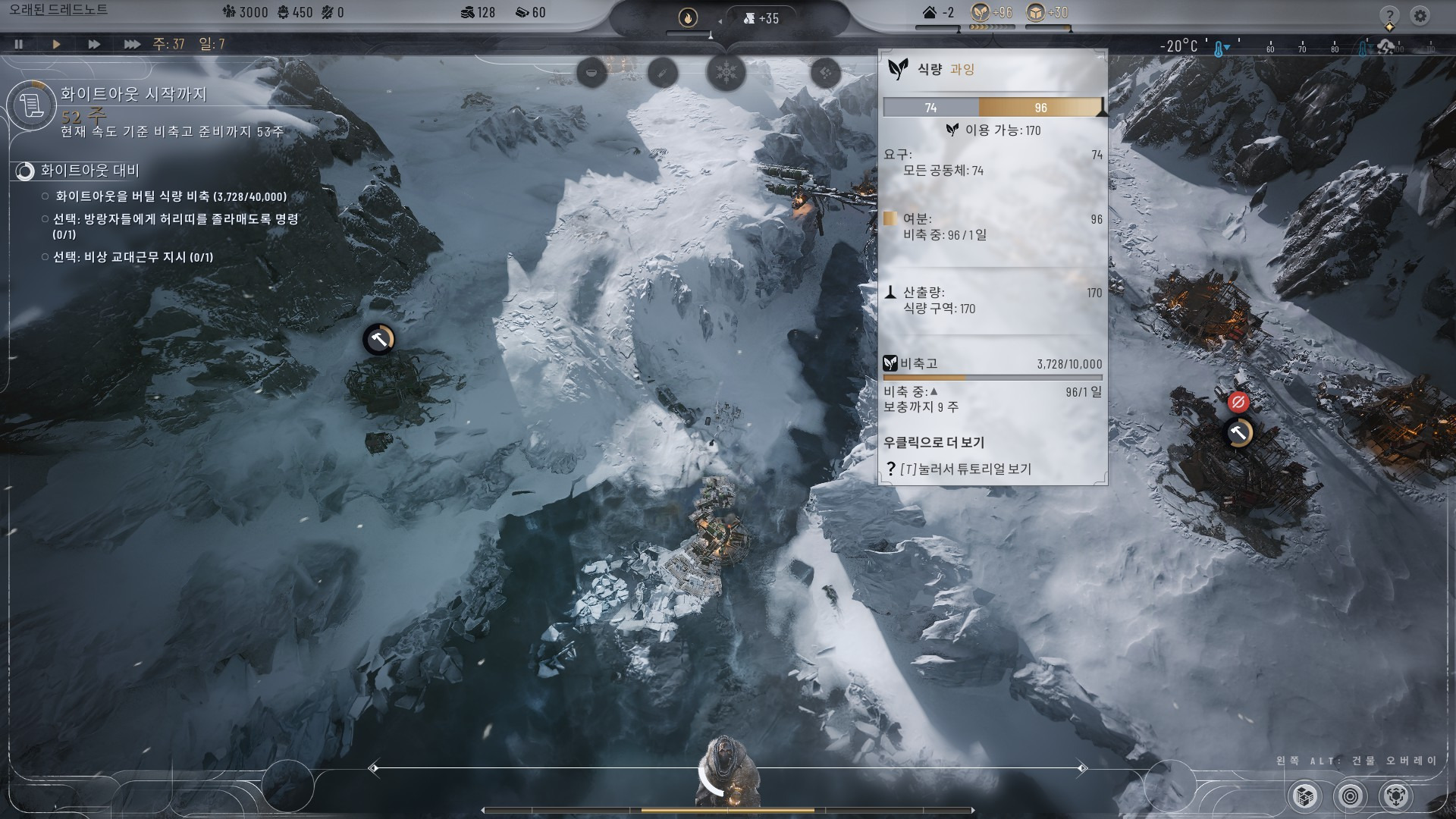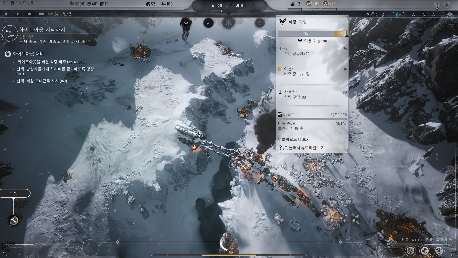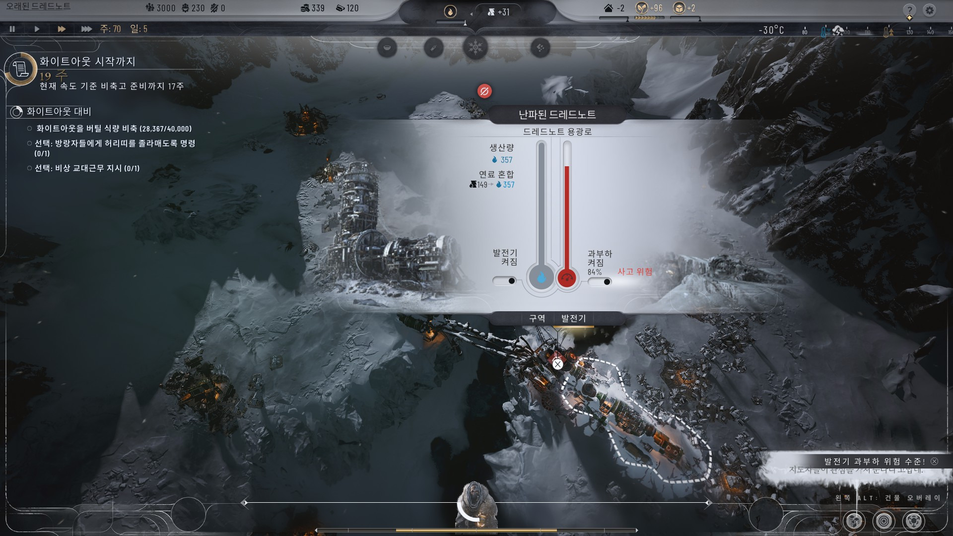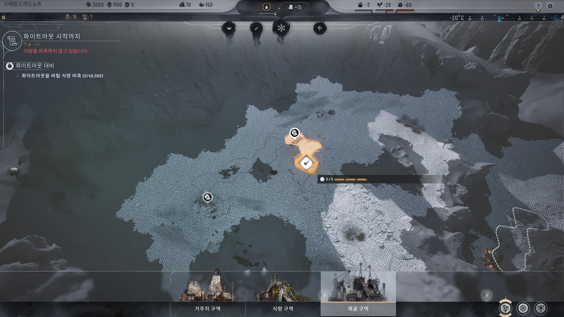 아슬아슬하게 열기 수요를 맞추는 데 성공했고, 식량 생산량도 화이트아웃 이전까지 4만을 모을 수 있을 정도로 늘어났습니다만,