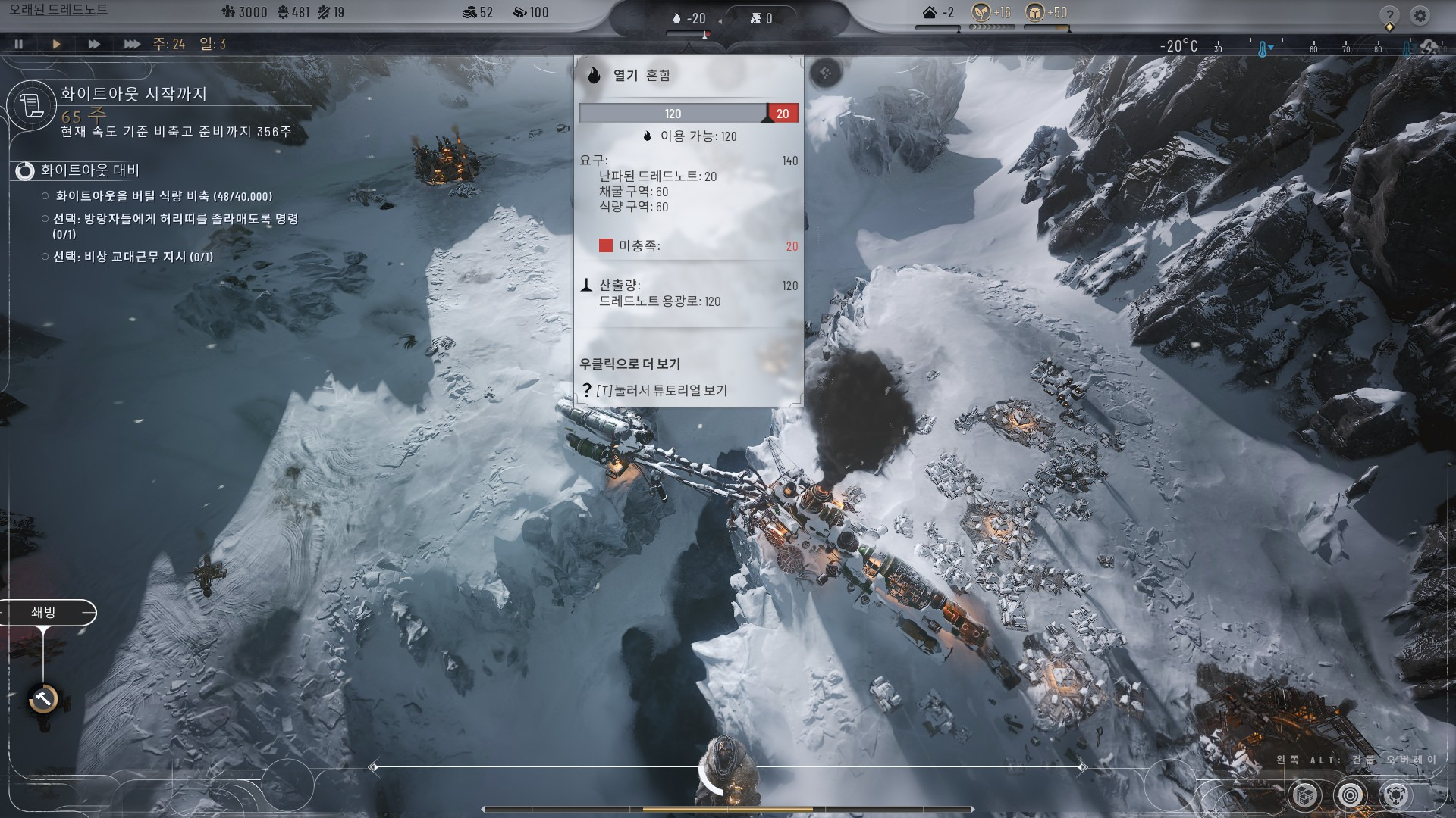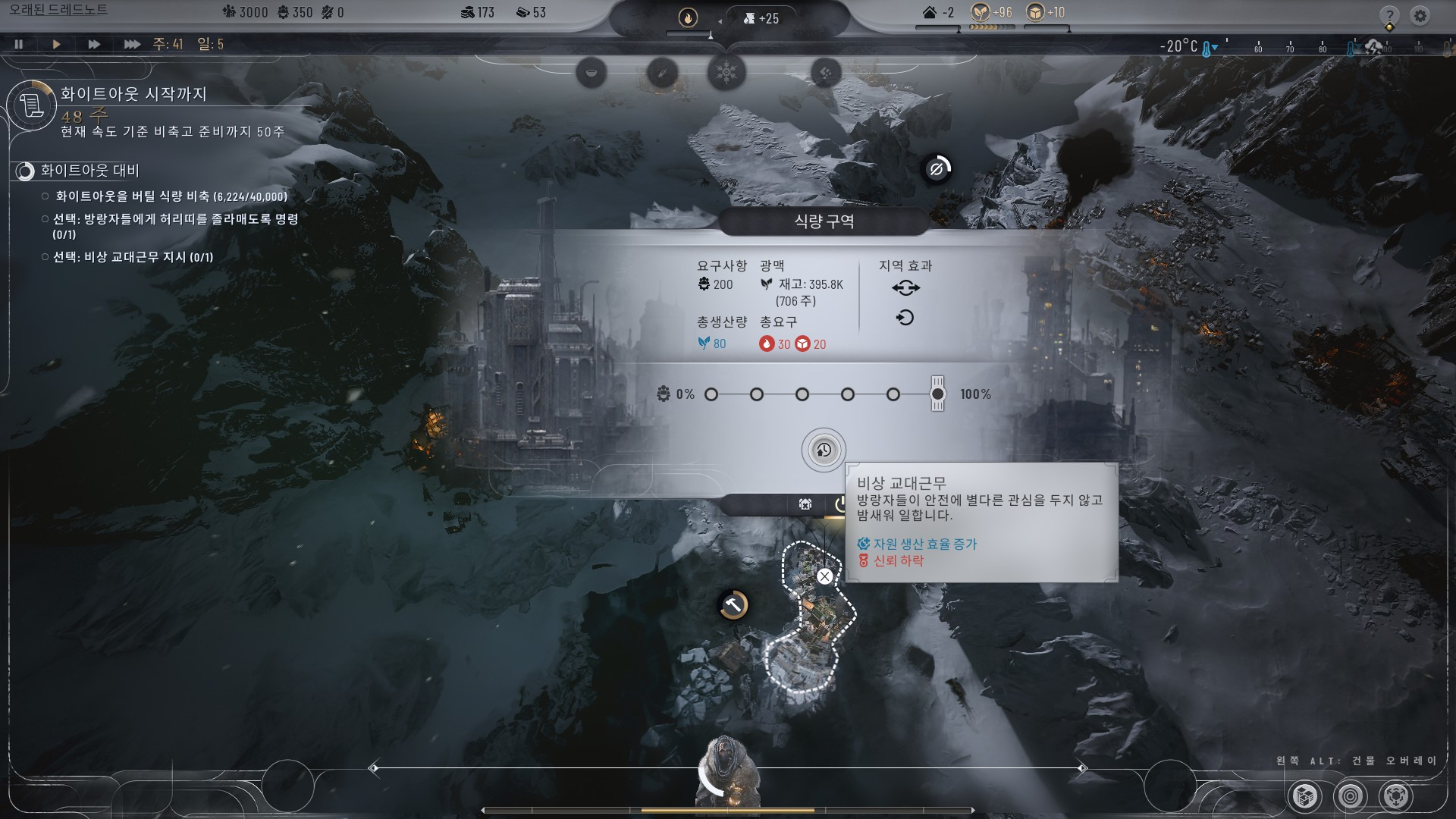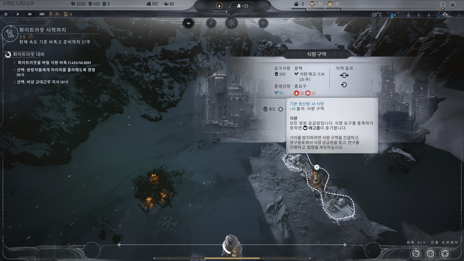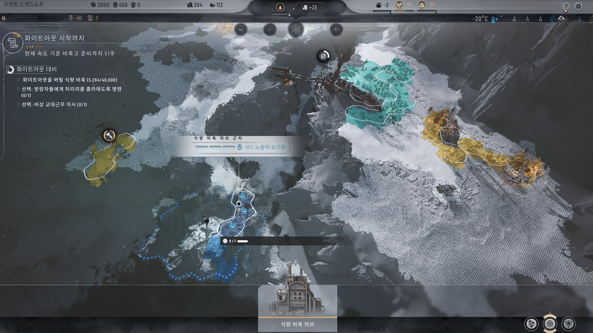 아슬아슬하게 열기 수요를 맞추는 데 성공했고, 식량 생산량도 화이트아웃 이전까지 4만을 모을 수 있을 정도로 늘어났습니다만,