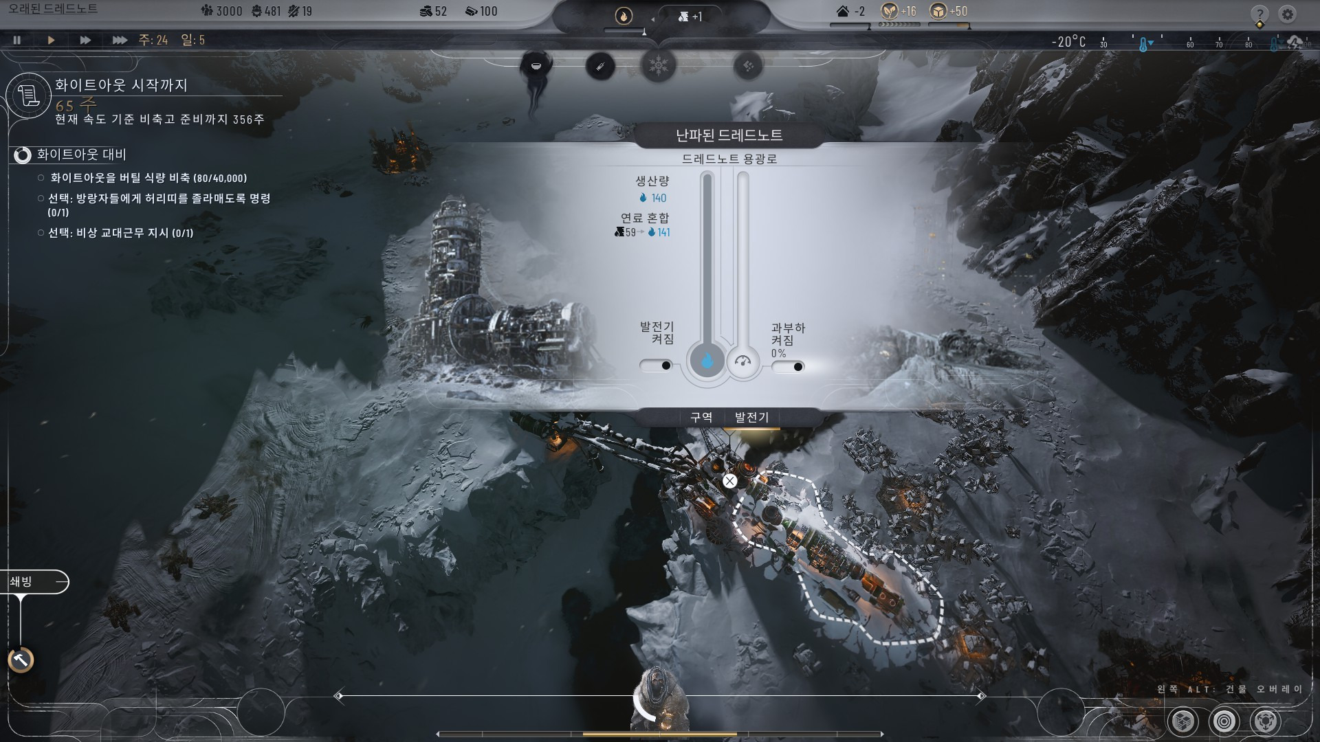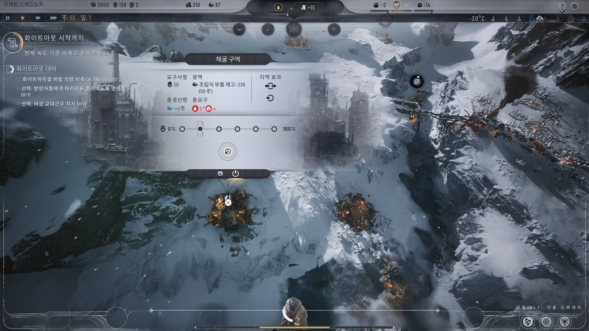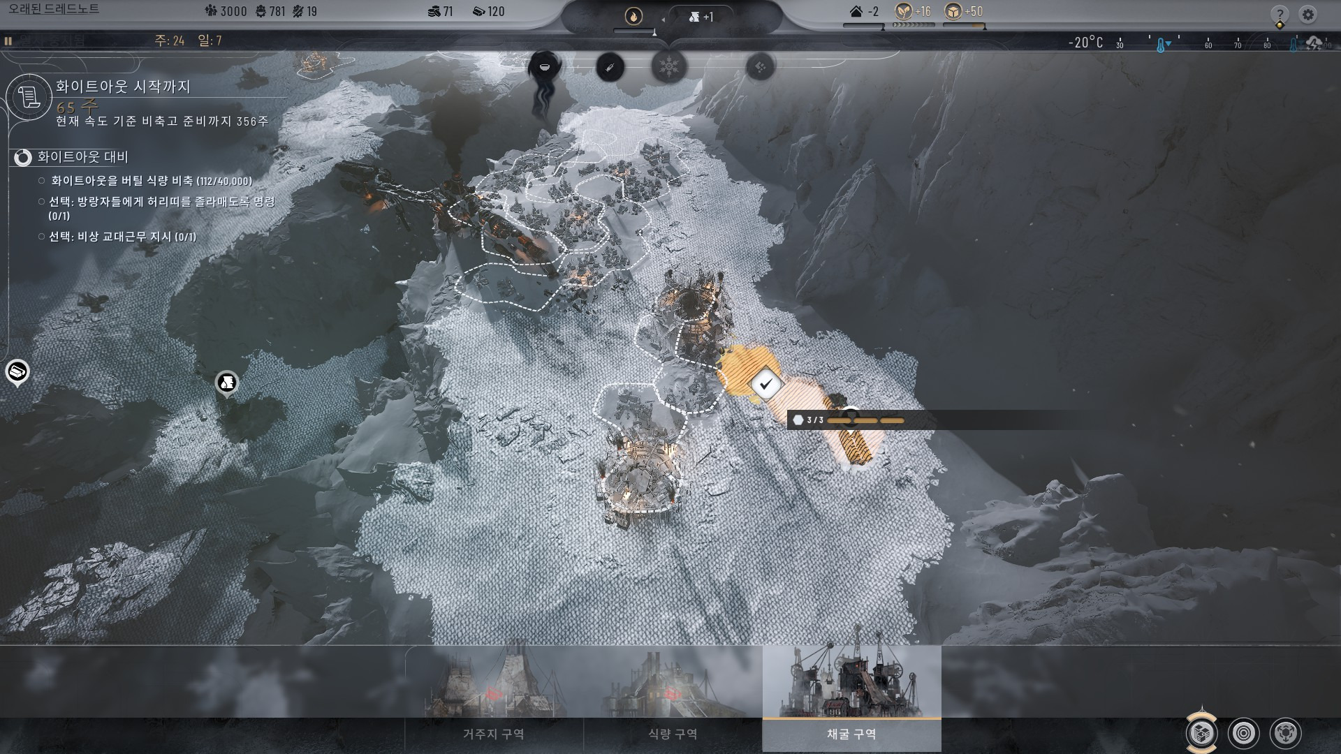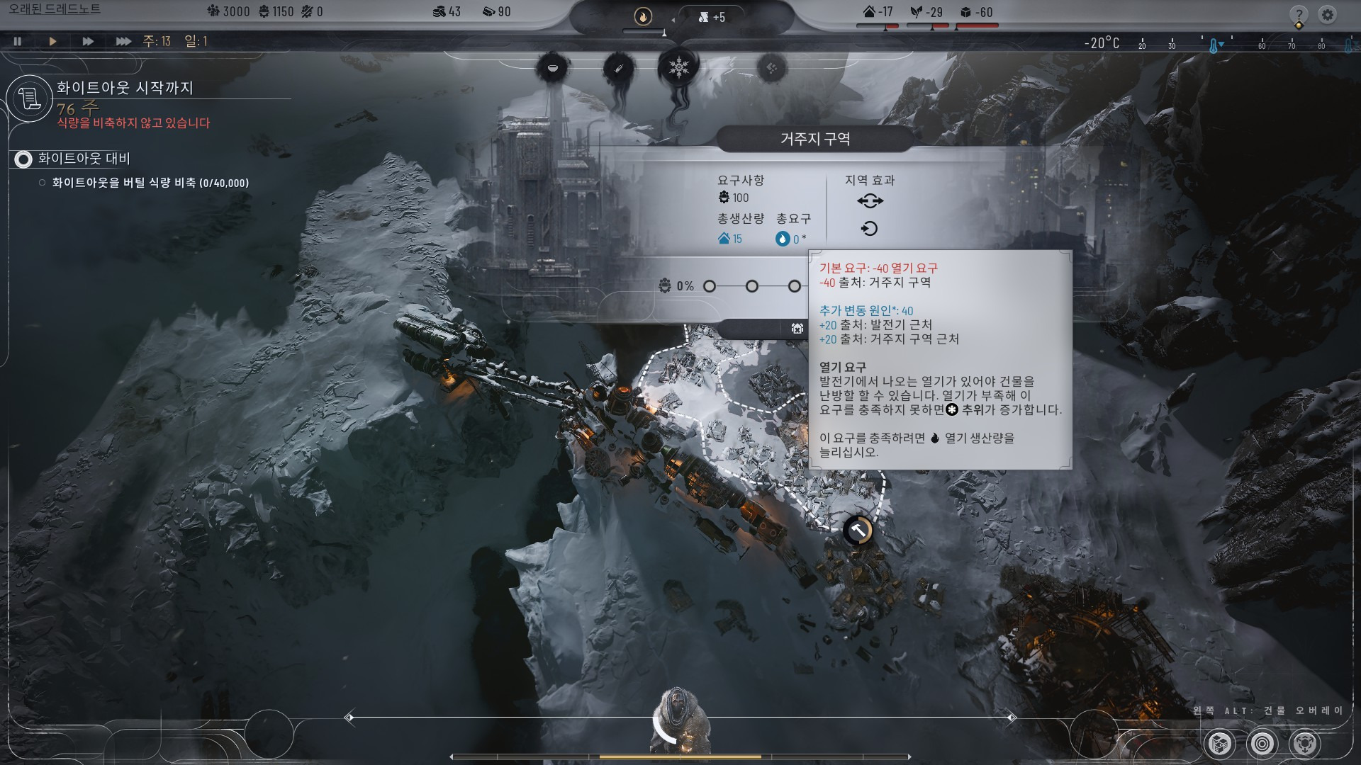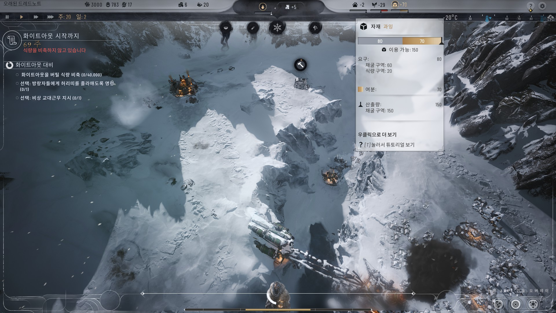 아슬아슬하게 열기 수요를 맞추는 데 성공했고, 식량 생산량도 화이트아웃 이전까지 4만을 모을 수 있을 정도로 늘어났습니다만,