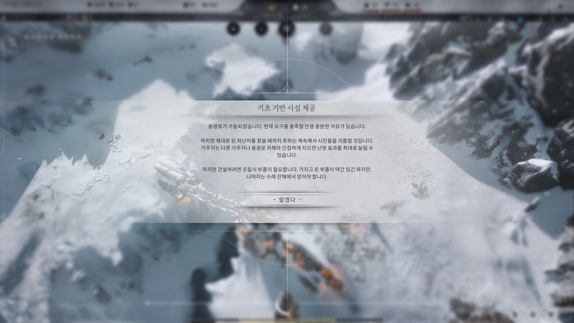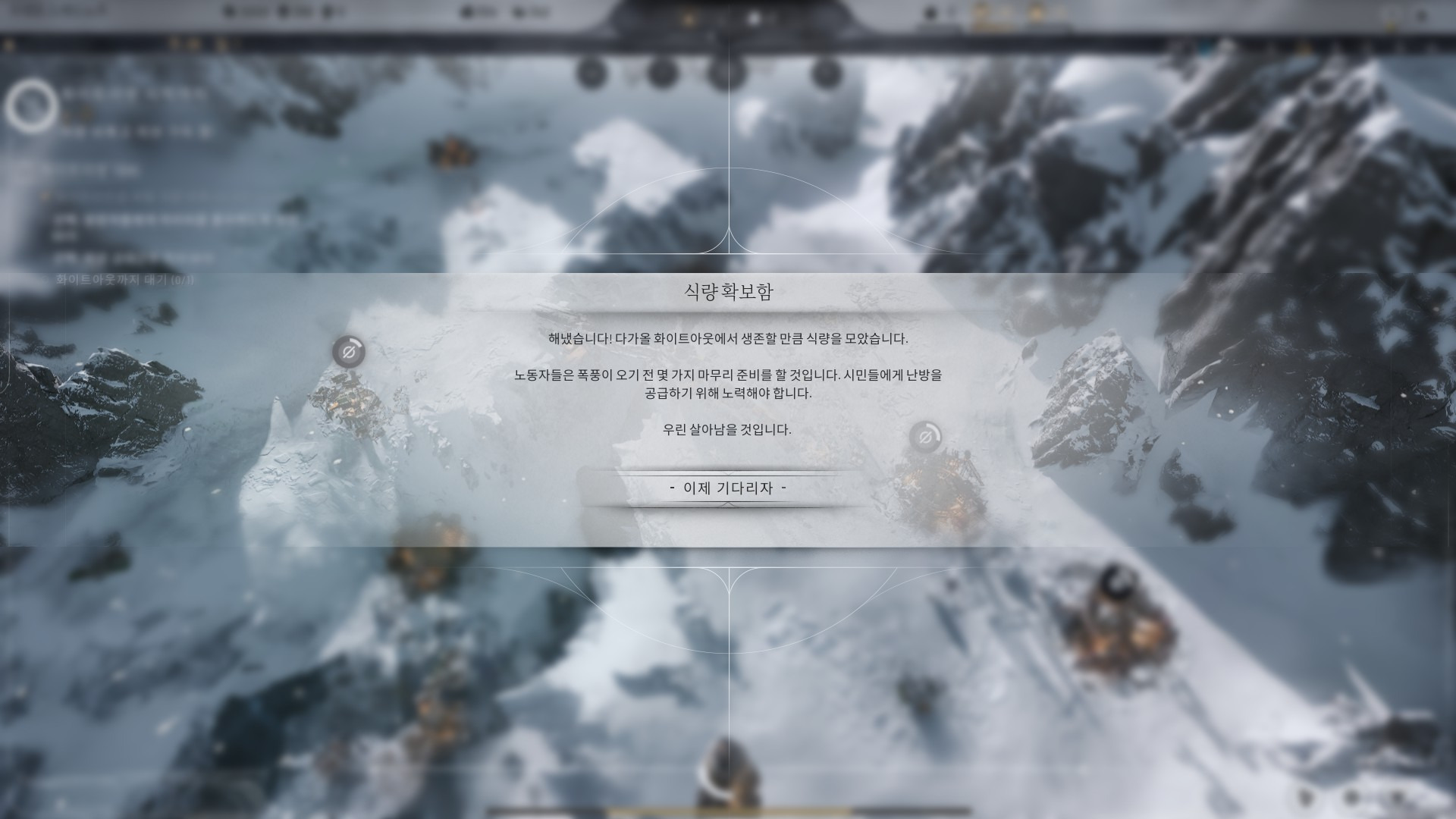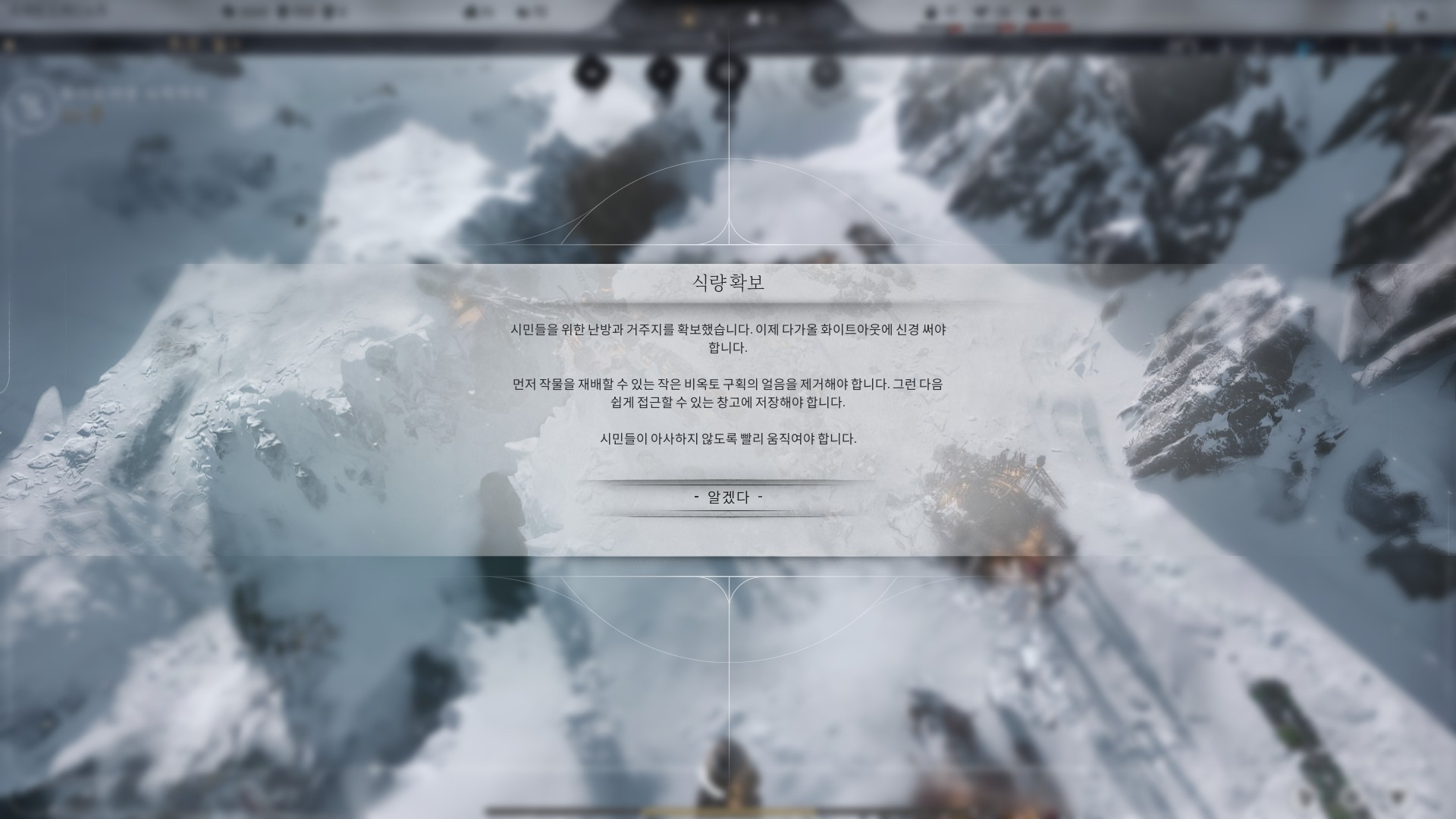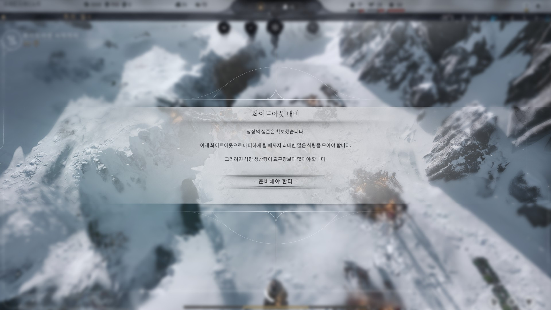 ‘기초 기반 시설 제공’ 목표를 달성한 뒤 뜬 메시지 창. 식량을 확보하고 화이트아웃을 대비하라고 합니다.