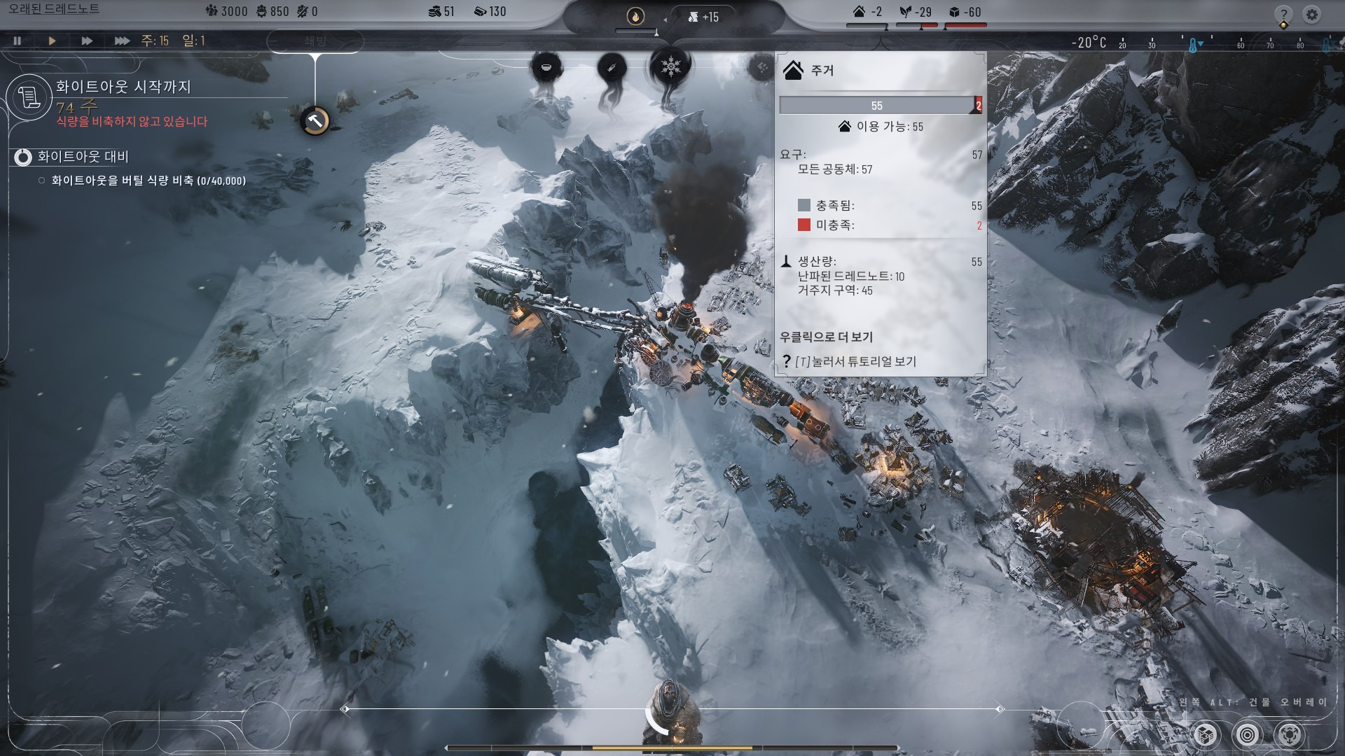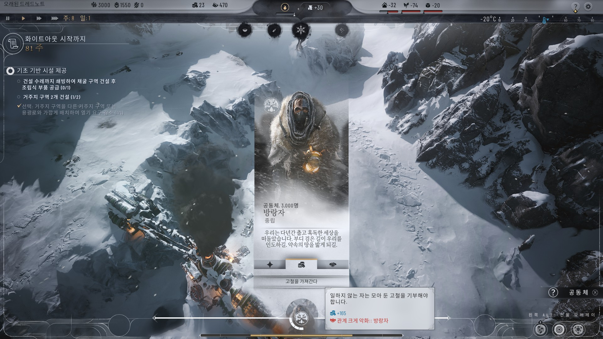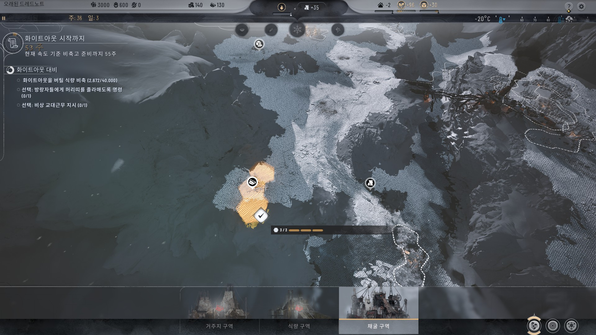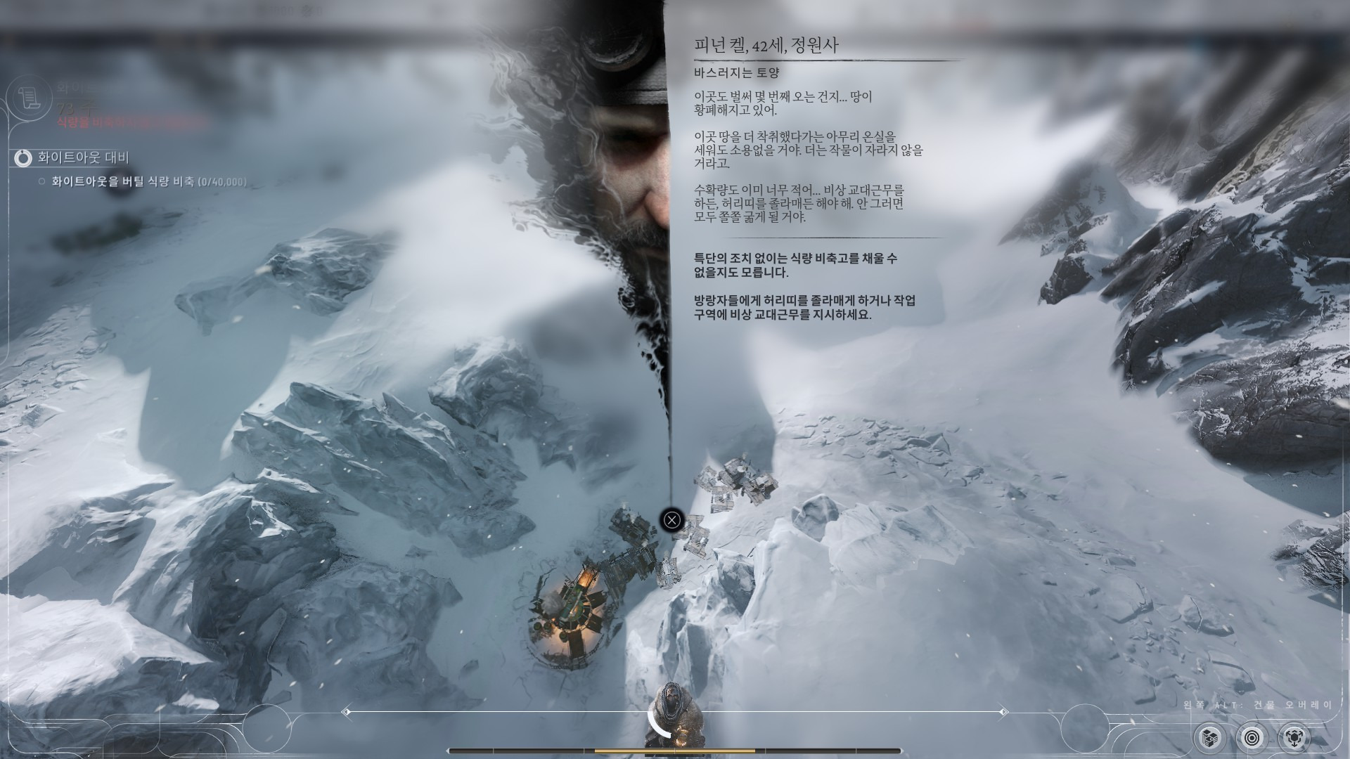 ‘기초 기반 시설 제공’ 목표를 달성한 뒤 뜬 메시지 창. 식량을 확보하고 화이트아웃을 대비하라고 합니다.