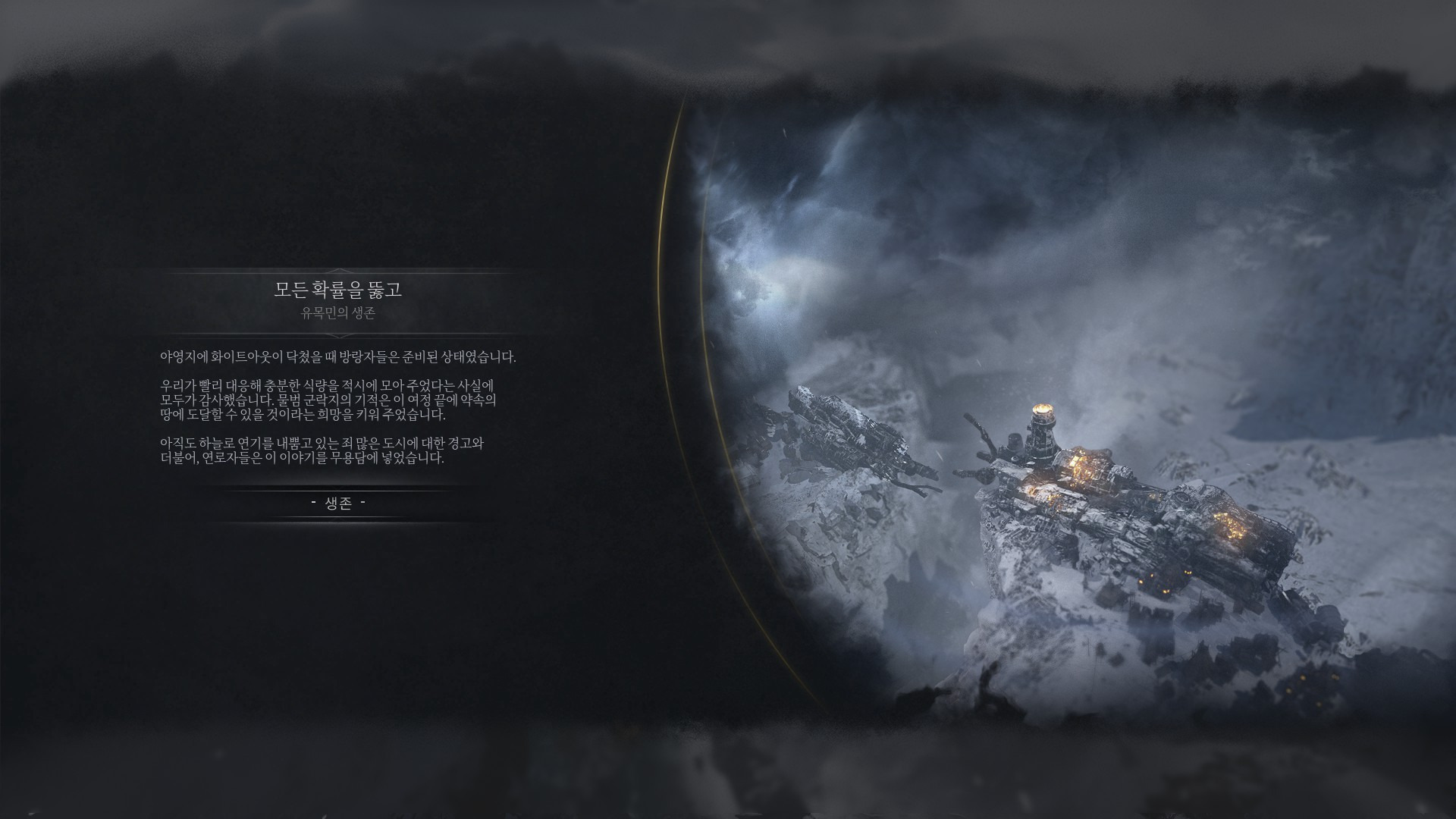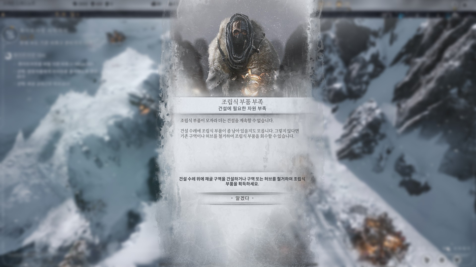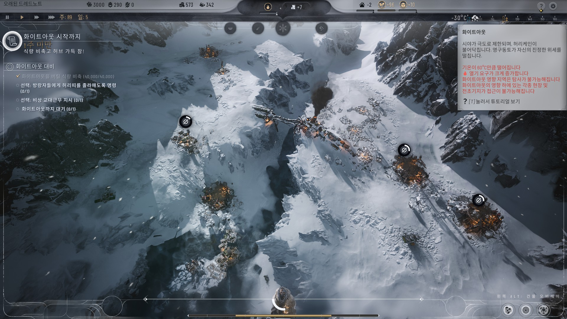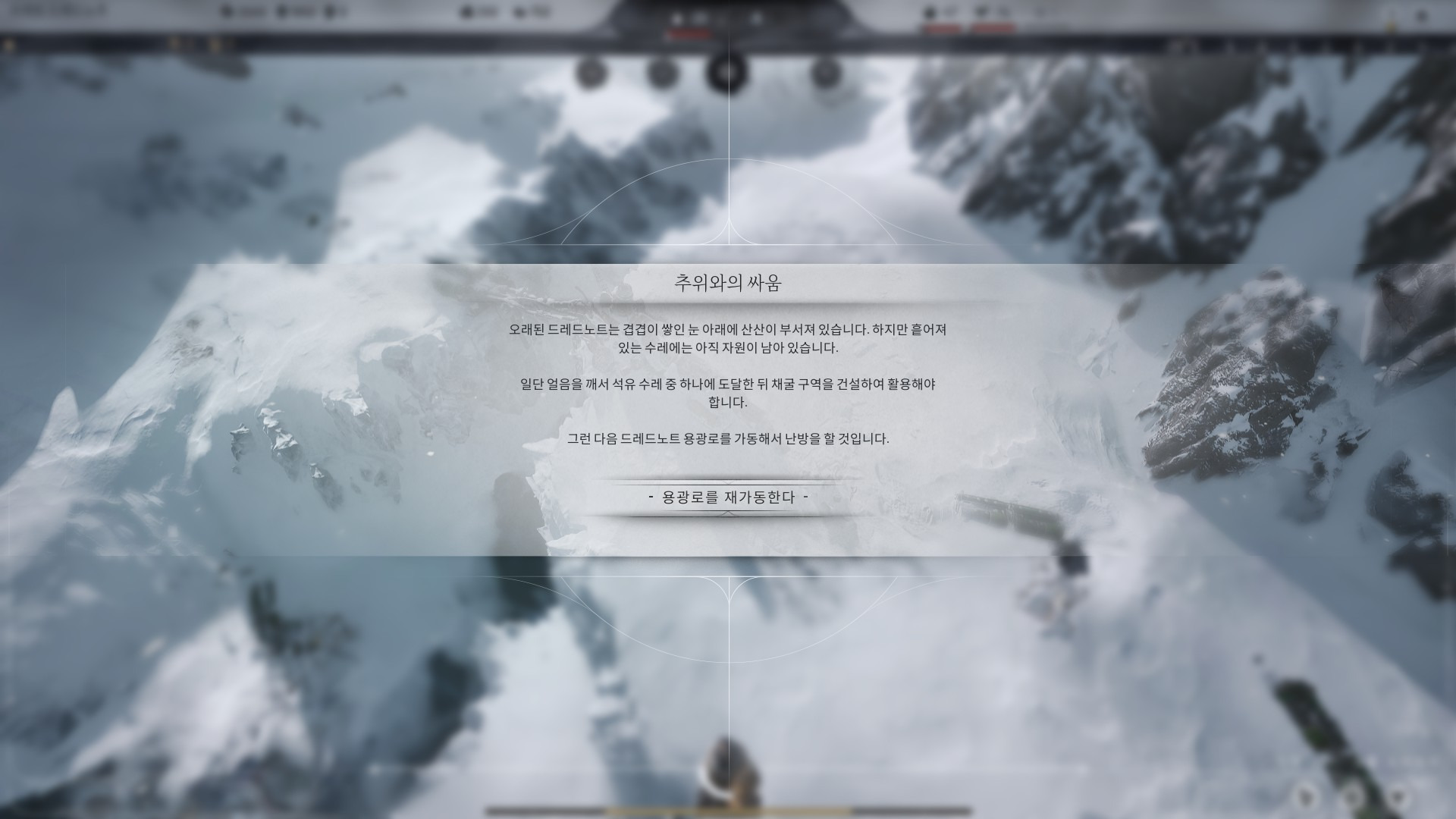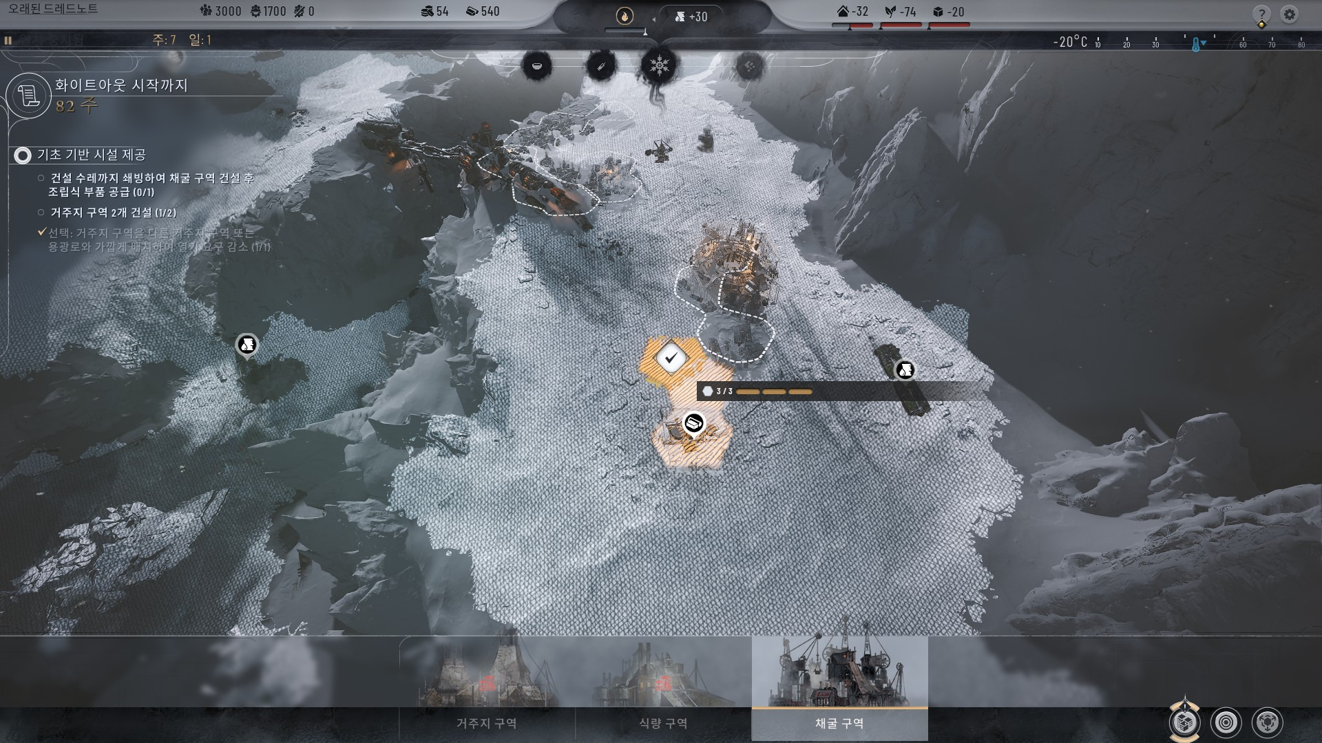 ‘기초 기반 시설 제공’ 목표를 달성한 뒤 뜬 메시지 창. 식량을 확보하고 화이트아웃을 대비하라고 합니다.