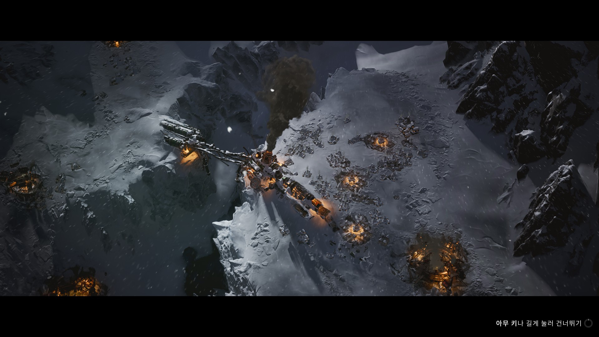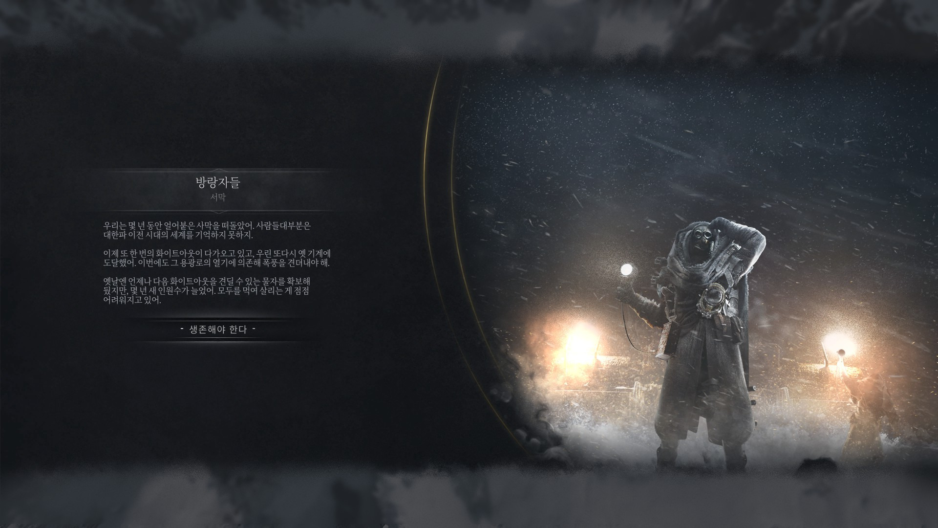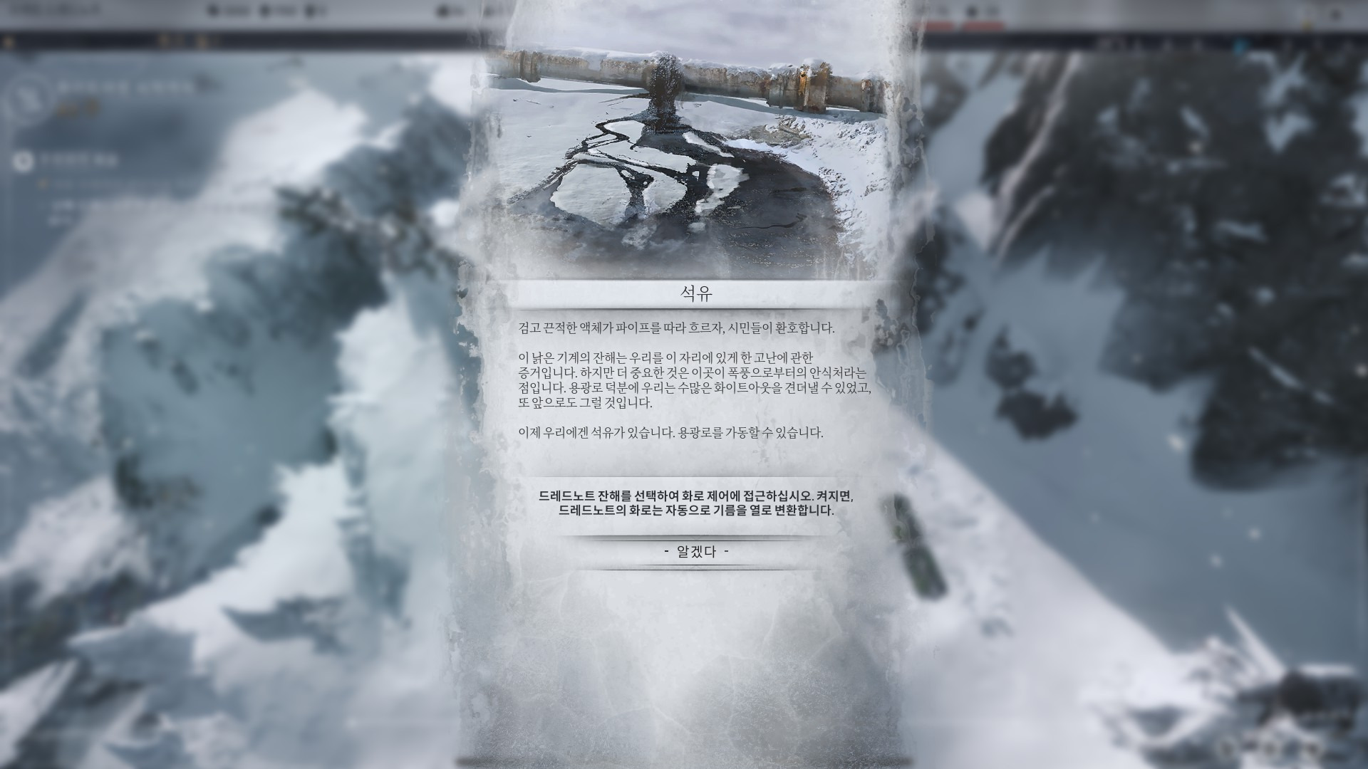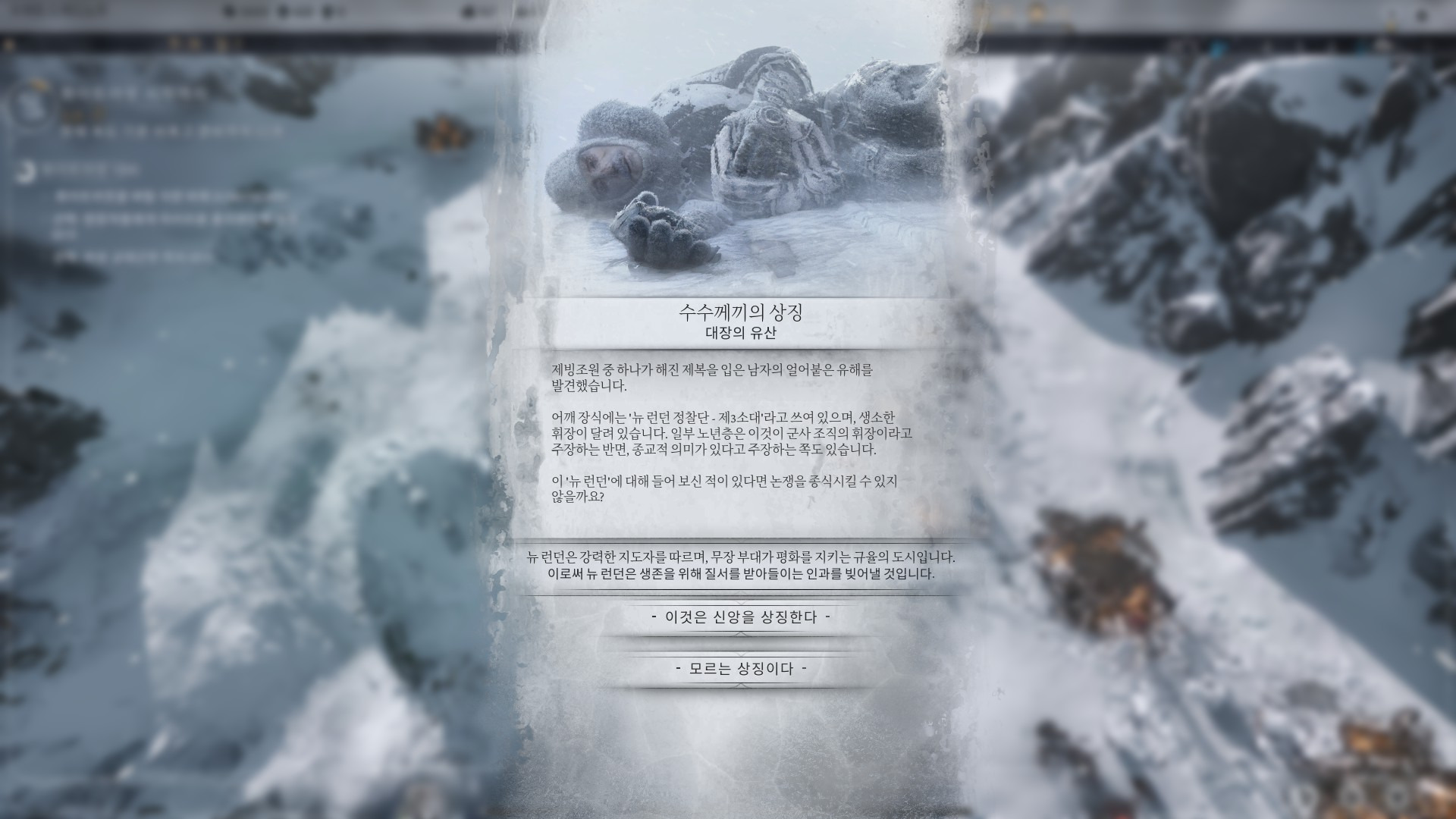 ‘기초 기반 시설 제공’ 목표를 달성한 뒤 뜬 메시지 창. 식량을 확보하고 화이트아웃을 대비하라고 합니다.