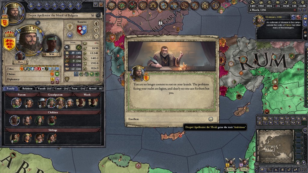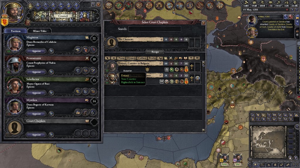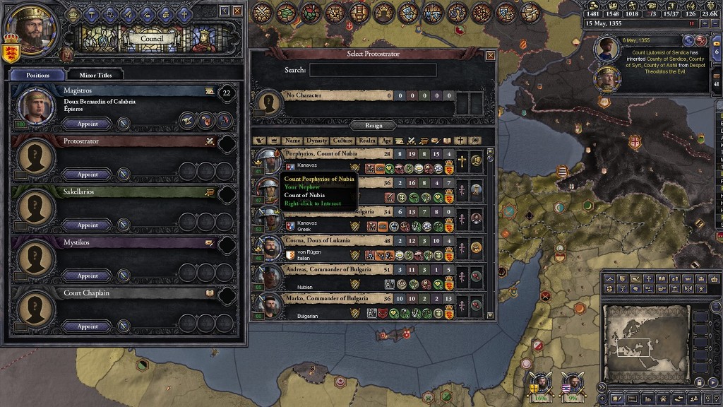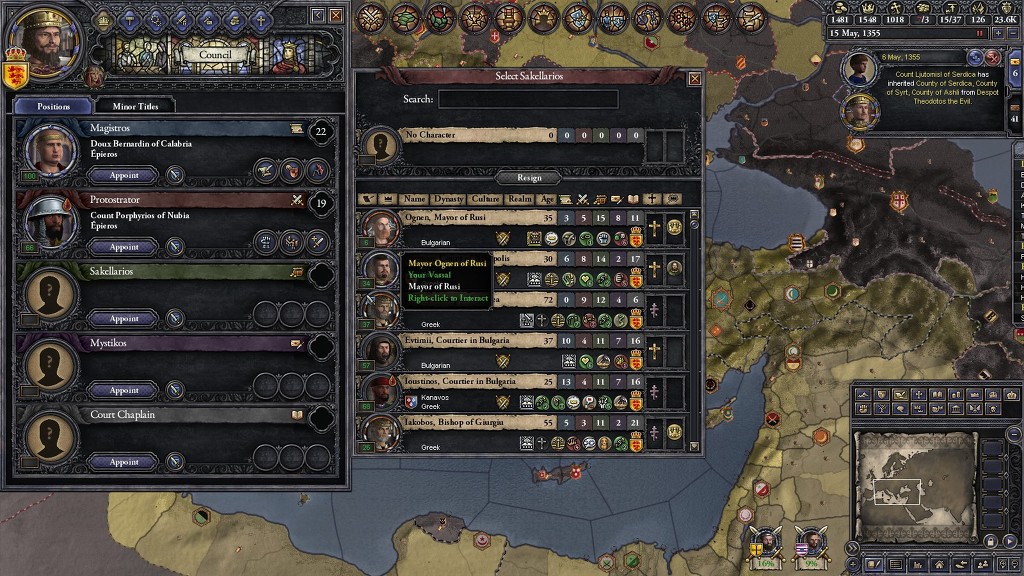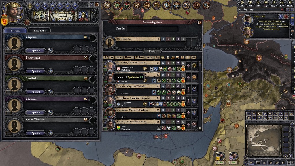 망한 참사회는, 다시 채우면 돼! 타르고비스테 가문의 니케포로스도 좋은 능력을 가졌지만, 선왕의 절친이었던 베르나딘의 능력치가 좀더 출중하네요. 재상은 베르나딘에게 맡기는걸로.