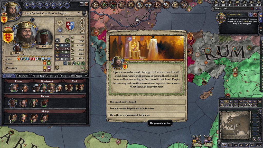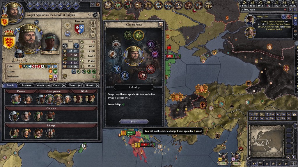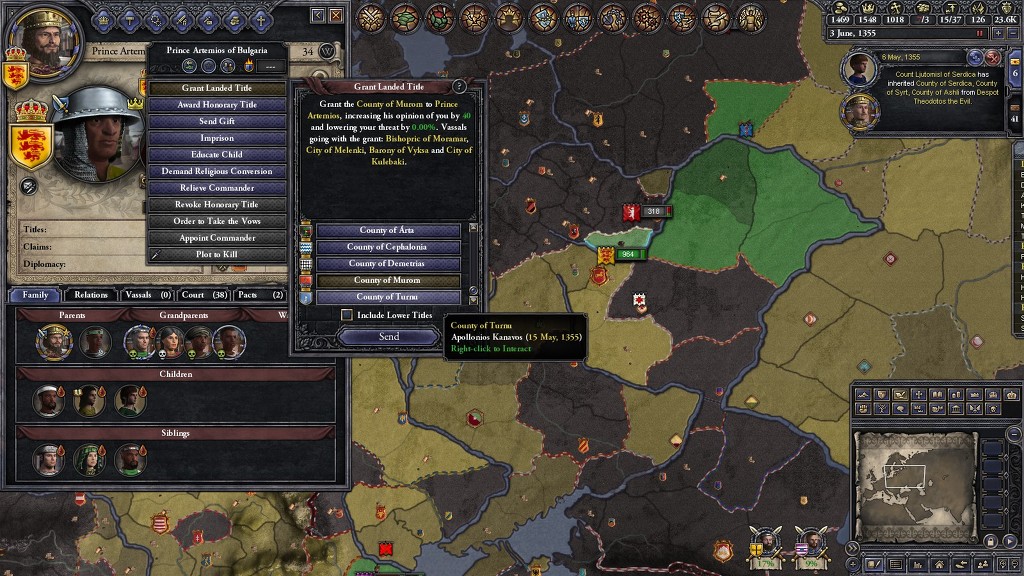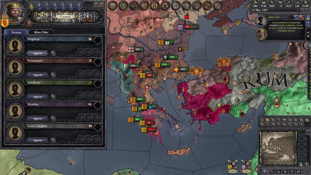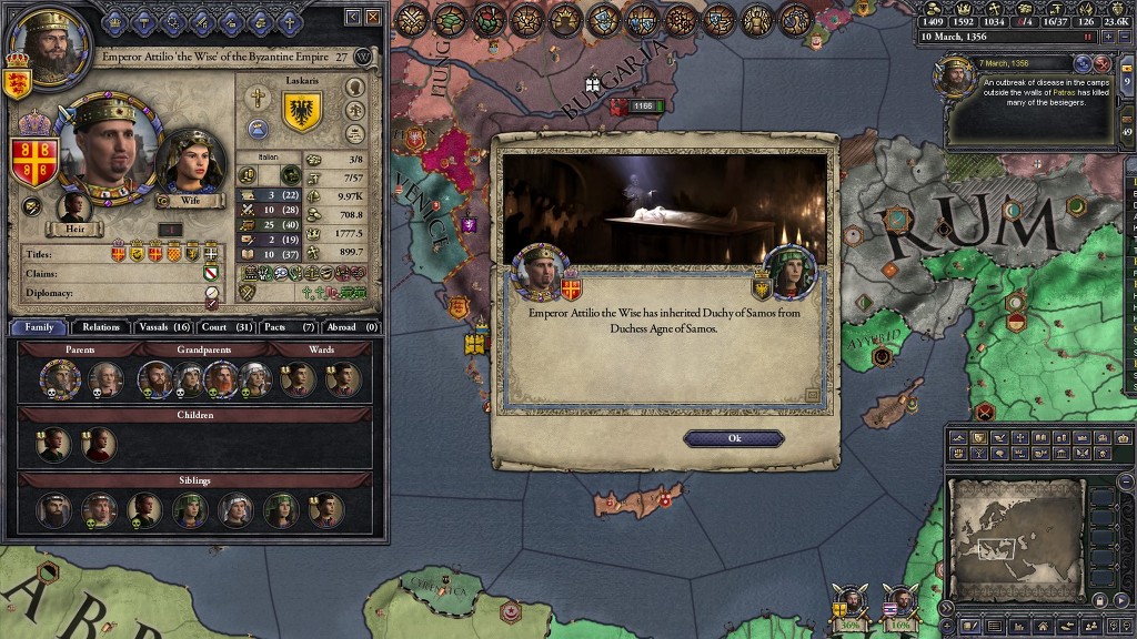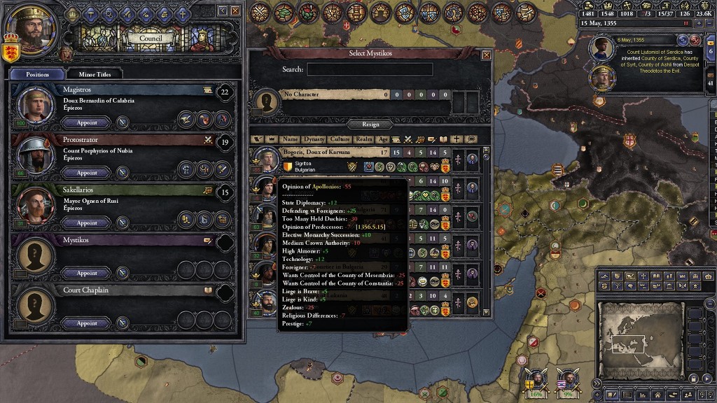 망한 참사회는, 다시 채우면 돼! 타르고비스테 가문의 니케포로스도 좋은 능력을 가졌지만, 선왕의 절친이었던 베르나딘의 능력치가 좀더 출중하네요. 재상은 베르나딘에게 맡기는걸로.