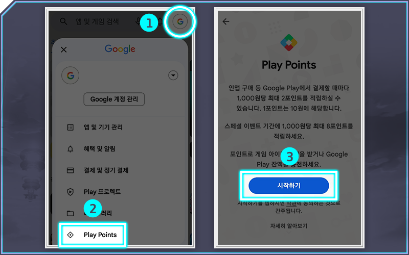 ㅇ 구글 플레이 스토어 접속 → 오른쪽 상단 프로필 아이콘 클릭 → Play Points 터치 → [시작하기] 터치