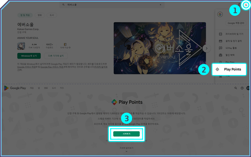 - [우측 상단 프로필] ▶ [Play Points] ▶ [사용] ▶ [내 앱/게임] ▶ [에버소울]에서 구글 플레이 포인트로 캐시 쿠폰을 구매 가능