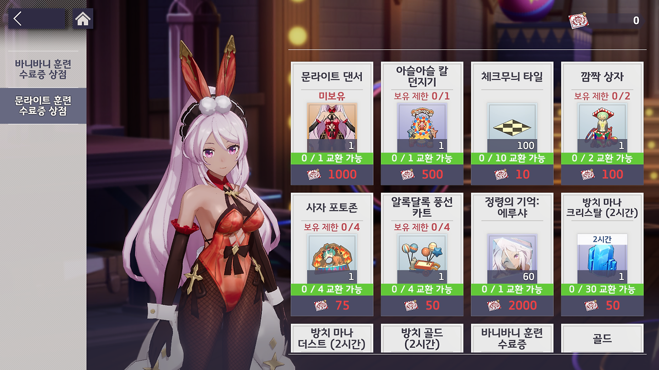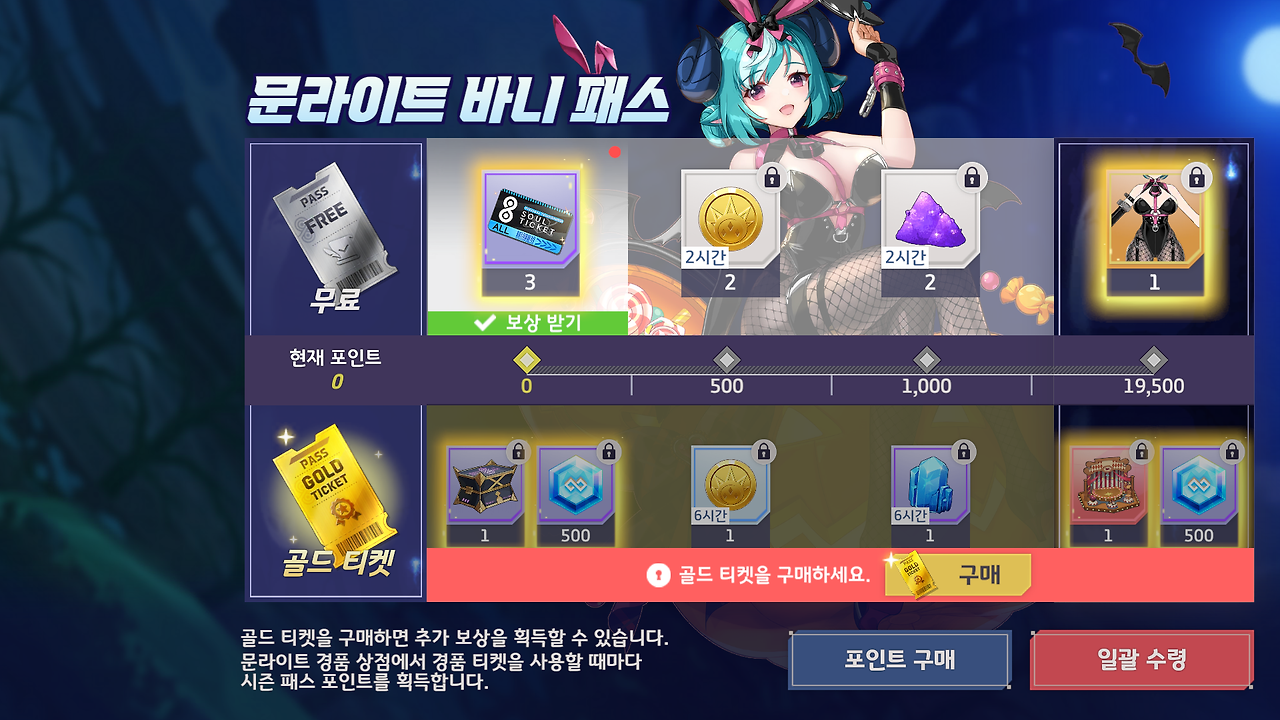 - 보상 획득에 필요한 <문라이트 바니 패스> 포인트가 부족할 경우 에버스톤 200개를 사용하여 500 포인트를 구매할 수 있습니다.