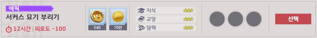 - 영지에 배치하면 신규 아르바이트 <서커스 묘기 부리기>를 수행할 수 있습니다.