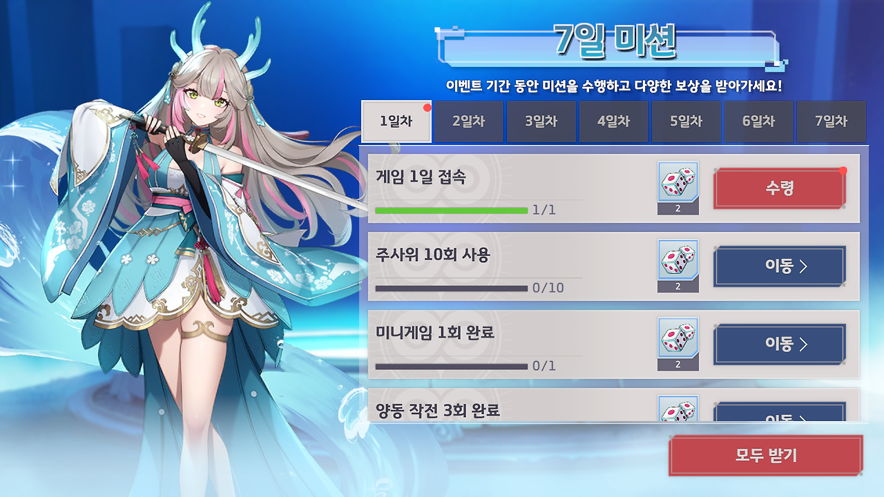 - 내용: 1일차 ~ 7일차까지 총 49개의 미션을 완료하여 다양한 보상을 획득할 수 있는 이벤트가 오픈됩니다.