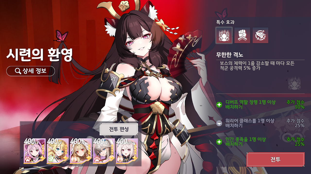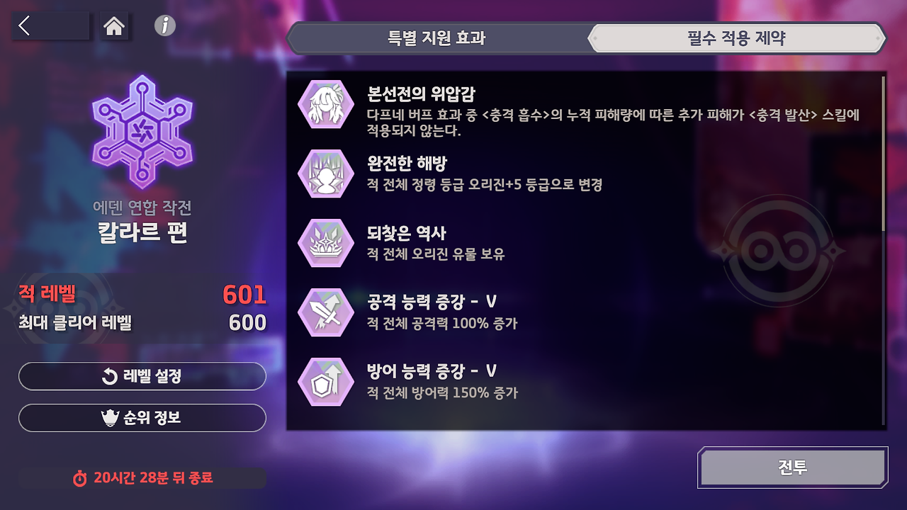 ㅇ 본선전도 예선전과 동일한 전투 시간과 적이 등장하며 적 레벨은 601 ~ 1,500로 설정할 수 있습니다.