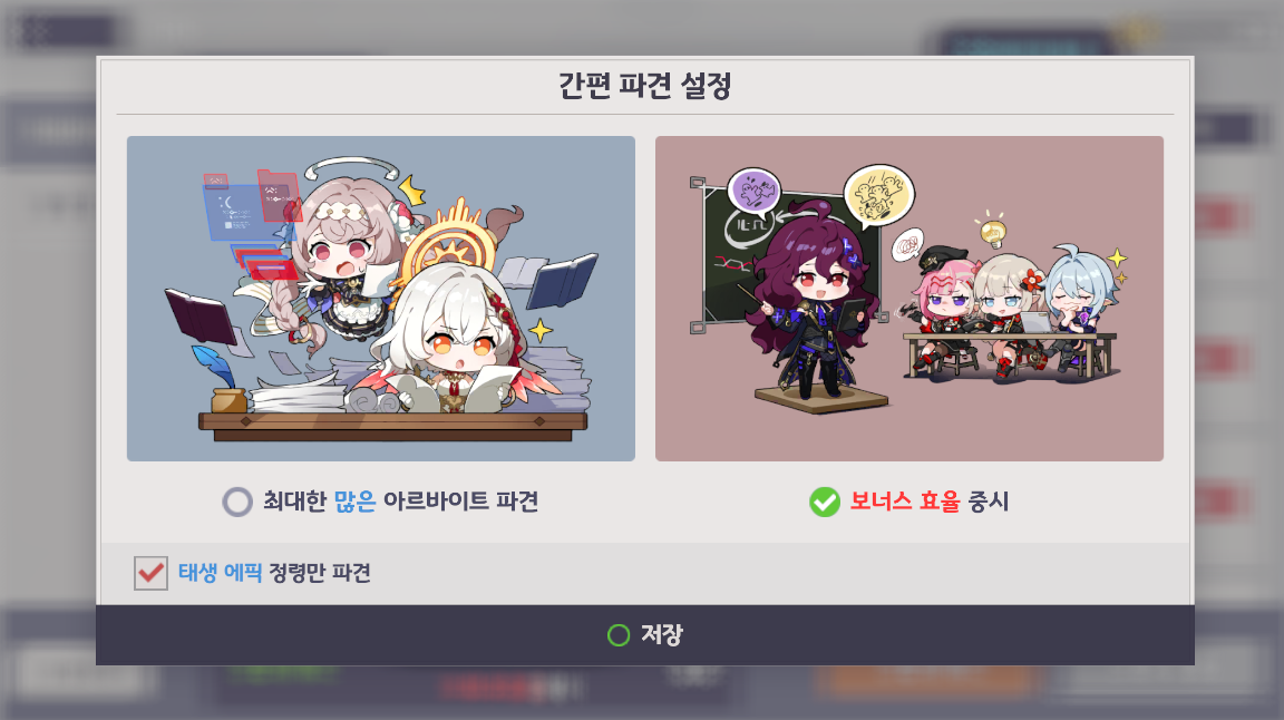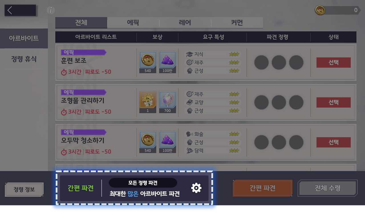- 간편 파견 시 <최대한 많은 아르바이트 파견> 혹은 <보너스 효율 중시> 중 원하는 방향성을 선택하여 아르바이트를 진행할 수 있습니다.