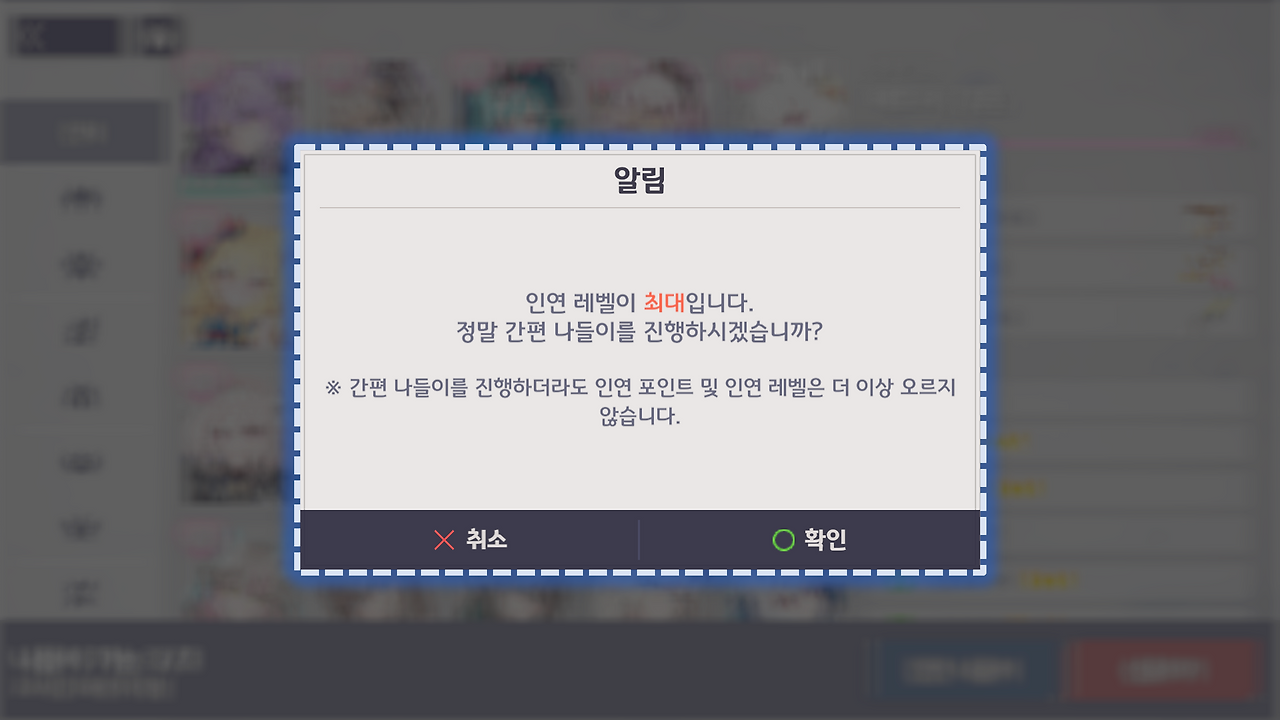 ㅇ <영지 관리> 내 인연 레벨이 최대인 정령과 간편 나들이 진행 시 안내 팝업이 노출될 수 있도록 개선됩니다.