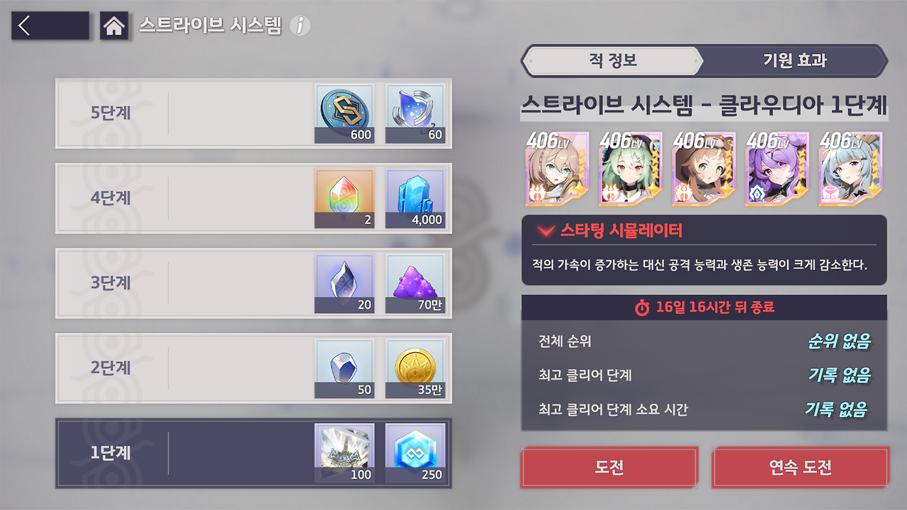 | 강철의 마음 | 동시에 투쟁심, 방어대형 제약을 포함하여 클리어 | 작전 기념 코인 2,000개 |