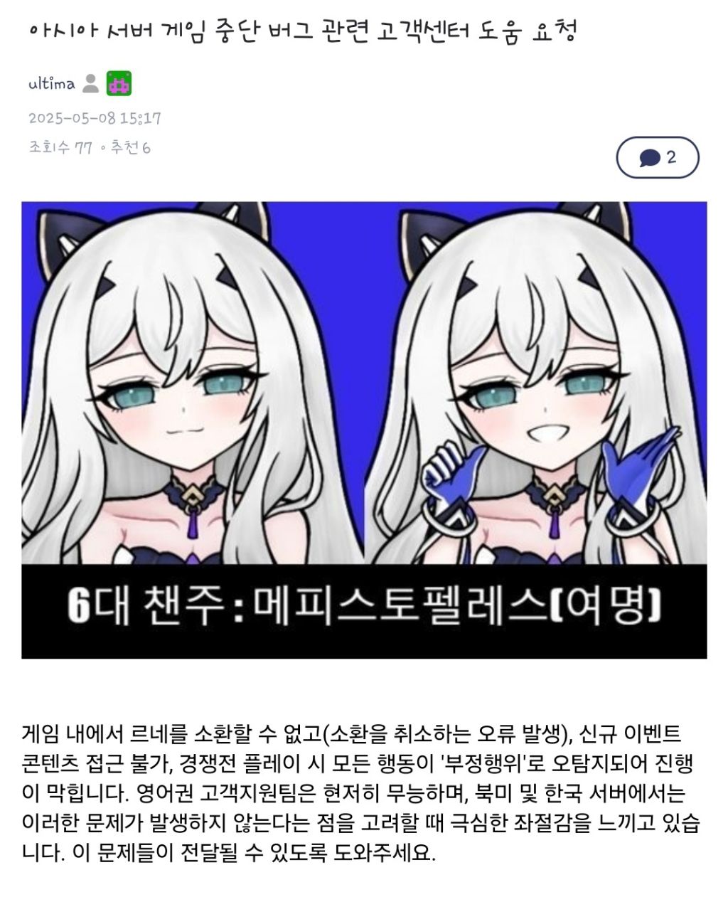 [오류]자네!!! 아시아섭에서 버그가 심각하다고 도움 요청이 왔다네!! 작성자리젤로테|작성시간25.05.08|조회수337 목록 댓글 0 글자크기 작게가 글자크기 크게가 자네!! 에버소울 톡방에서 이와 같은 얘기가 전해져서 소식을 전하러 왔다네!!아시아섭도 2년이나 같이 즐긴 소중한 유저들인데 얼른 문제를 해결해주시게!!부탁한다네!!! 다음검색 현재 게시글 추가 기능 열기 북마크 공유하기 신고 센터로 신고 댓글 댓글 0 댓글쓰기 답글쓰기 댓글 리스트