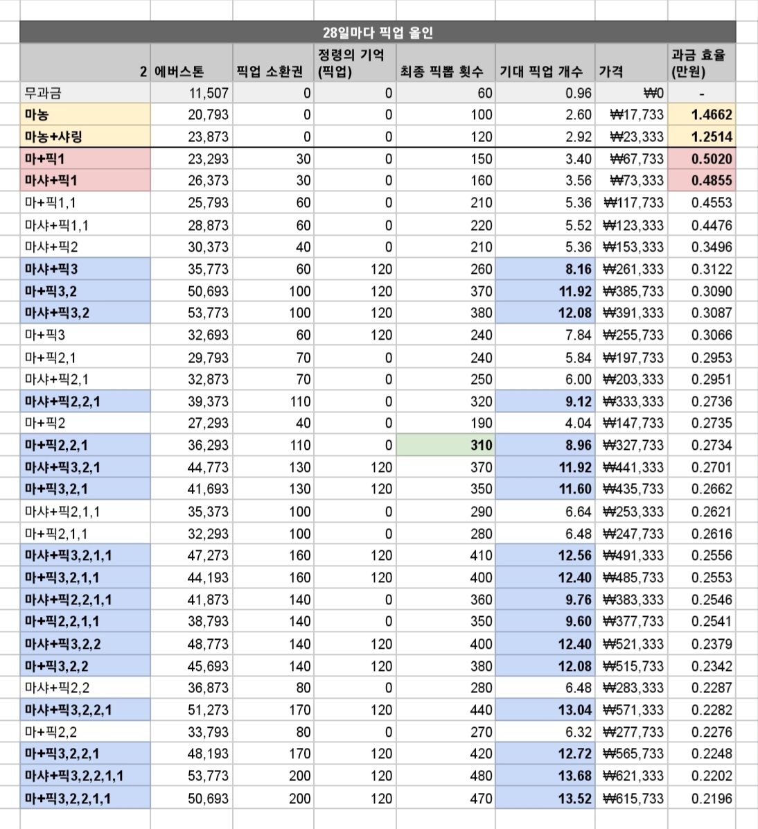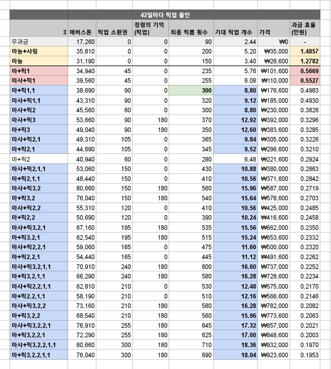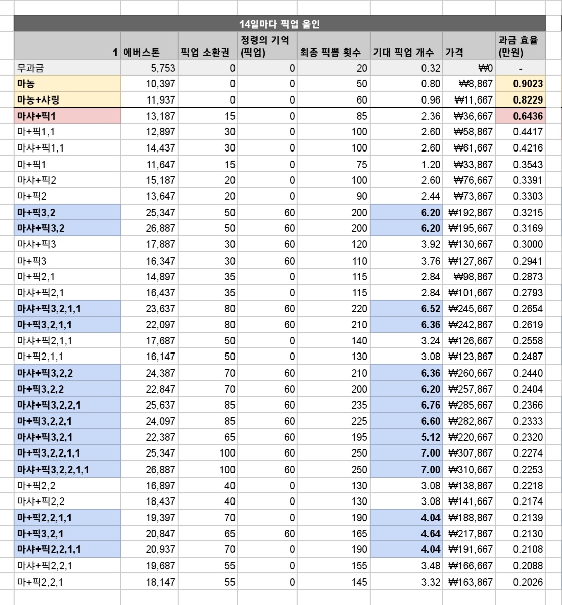 4) 신캐 픽업 주기가 14일이므로 월정액 패키지의 가격 및 구성품을 14일치로 환산해서 정리했습니다.
