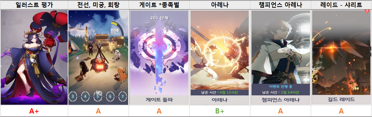- PVE 레이드 : 필자는 샤리트에서 아야메를 기용하고 있습니다. 물론, 유물이 오리진이라는 가정 하이며 현재 훌륭한 마나 감소 역할로 보스의 궁극기를 늦추는 역할을 수행하고 있습니다. 다만 유물의 강화도에 의존한다는 점, 그리고 지속딜러의 특성상 딜적으로는 불리한점을 고려해 A로 판정합니다.