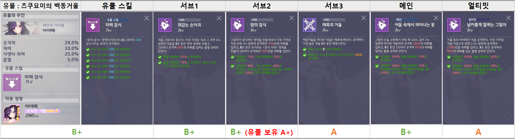 - 종합평가는 B+입니다. 위에 계속 쓸데가 없다고 말씀드렸습니다만 스킬들의 계수는 상대적으로 높습니다. 고강화의 경우 쓸만한 곳이 몇 군데 보이기는 하나 역시나 초 고스펙을 갖춰야 하는 것이기에 높은 점수를 드리긴 어렵습니다.
