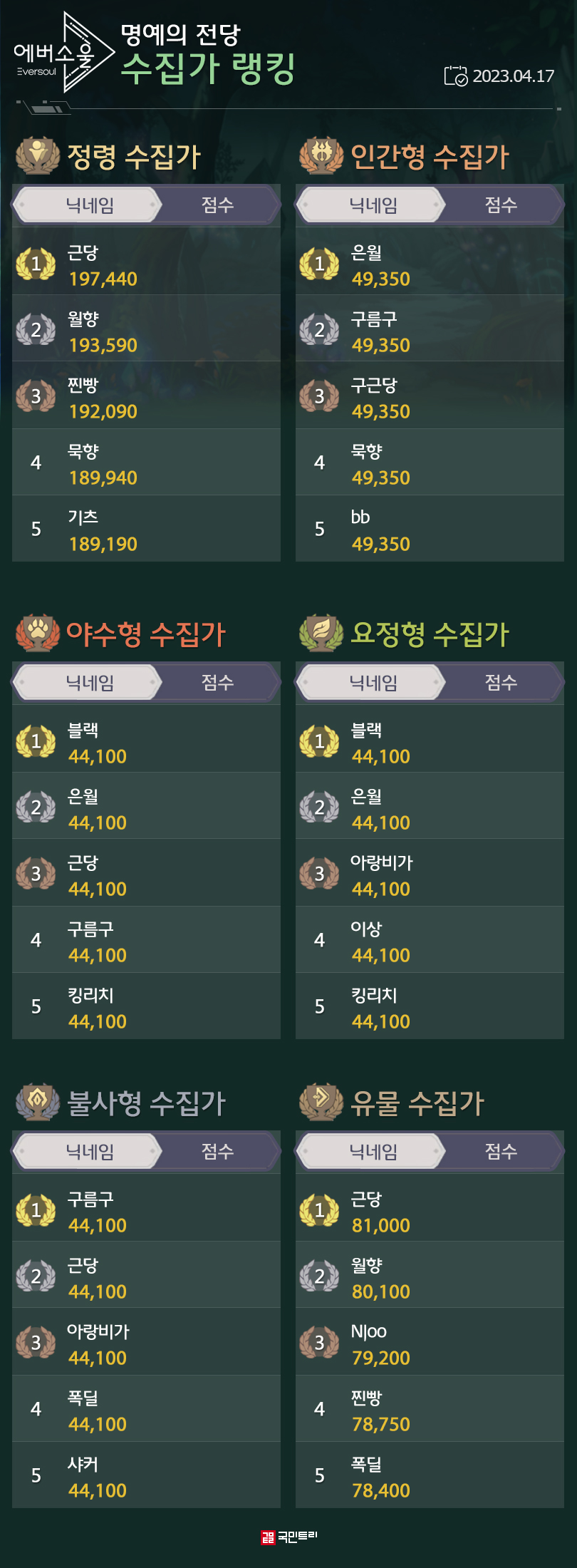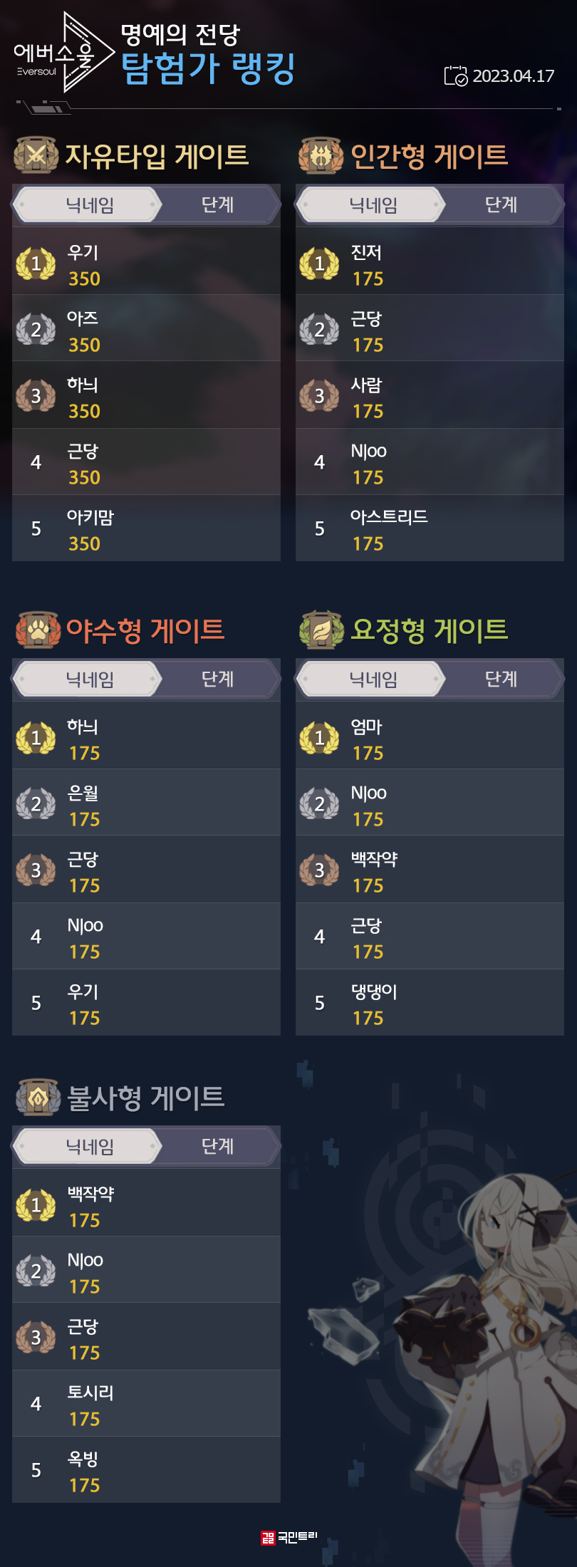 특정 콘텐츠 달성 일자를 기준으로 랭킹을 매기는 ‘명예의 전당’입니다. 지난주 신규 지역과 게이트가 모두 클리어되면서 눈에 띄는 변화는 없었습니다. 정령 수집가 랭킹에 찐빵 님과 기츠 님이 TOP 5에 다시 이름을 올린 것과 당근 님이 닉네임을 바꾼 정도였죠.