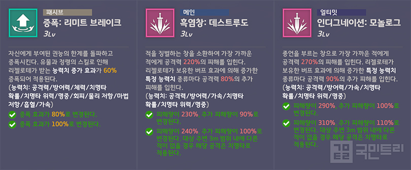 메인, 얼티밋 스킬은 공통으로 ‘공격력, 방어력, 가속, 치명타 확률, 치명타 위력, 명중’ 버프 종류마다 추가 피해가 들어가고, 레벨 3 기준 적 주변 3m 내에 다른 적이 없으면 반드시 치명타가 발동합니다. 레이드 보스처럼 혼자 등장하는 적을 상대할 때 최대 능력을 발휘하는 셈이죠. 대신 해당 버프가 걸려있지 않을 때 사용하면 다른 얼티밋 스킬보다 피해량이 더 적은 편입니다.