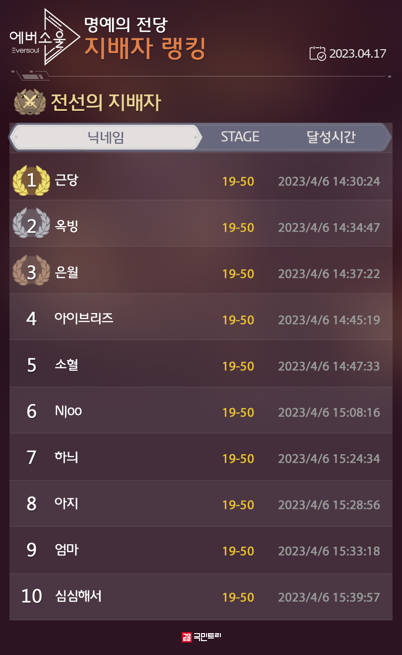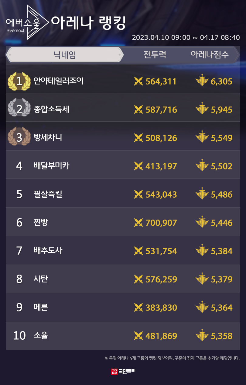 ※ 해당 정보는 4월 10일 오전 9시부터 4월 17일 오전 8시 40분까지 진행된 5개 그룹의 아레나 랭킹 정보 기준입니다.