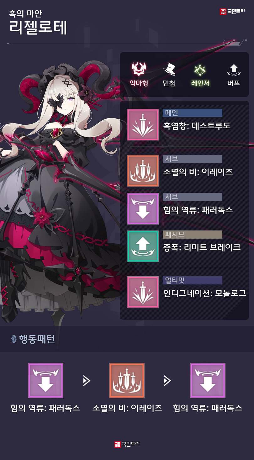 서브 스킬 2개는 디버프 효과를 보유하고 있습니다. ‘소멸의 비: 이레이즈’는 리젤로테의 유일한 범위 공격기로, 피격 대상의 버프 효과를 최대 3개까지 제거하고 마나 850을 회복하죠. ‘힘의 역류: 패러독스’는 가장 가까운 적 한 명에게 창을 내리꽂아 피해를 주고, 방어력, 물리 저항, 마법 저항 버프가 걸려있을 경우 15초 동안 최대 36% 감소시켜 버립니다. 레벨 3을 달성하면 해제 불가 디버프로 강화되죠.