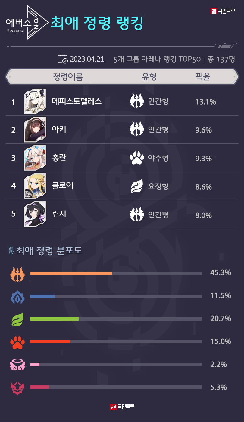 이번 집계는 5개 그룹에서 최애 정령을 모두 등록한 137명의 자료를 기반으로 했습니다. 순위 변동은 없었지만, 아키와 홍란의 픽율이 소폭 감소했죠. 아키는 10%에서 9.6%로 떨어졌는데, 홍란도 같이 소폭 하락하면서 순위를 유지했습니다.