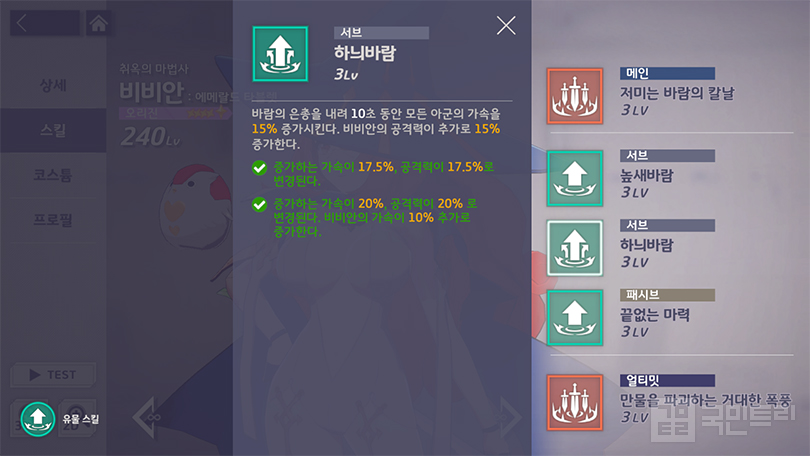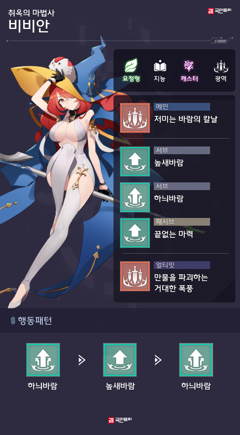 특히, 서브 스킬 ‘하늬바람’이 좋은 평가를 받고 있습니다. 10초 동안 모든 아군의 가속과 공격력을 최대 20% 증가시키고, 레벨 3엔 자신의 가속이 10% 추가로 오르죠. 비비안은 패시브 ‘끝없는 마력’ 효과로 다른 정령보다 마나 회복이 빠르고, 유물 스킬로 메인 ‘저미는 바람의 칼날’을 사용하면 일정량의 마나를 돌려받는 효과가 있어 스킬 회전이 굉장히 빠릅니다. 아울러 얼티밋 ‘만물을 파괴하는 거대한 폭풍’은 저미는 바람의 칼날로 생기는 ‘바람의 칼날’ 버프의 중첩 수에 따라 대미지가 증폭되죠.