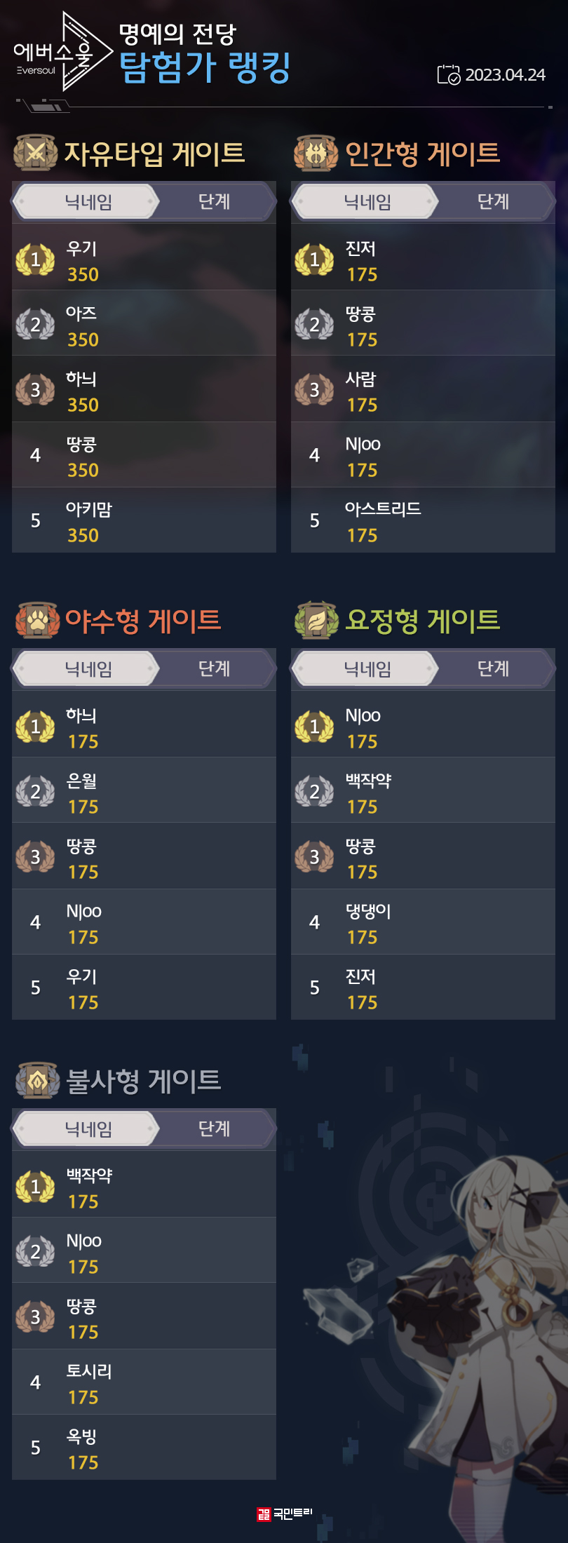안녕하세요. ‘에버소울’ 메카 랭킹 시간입니다. 아레나 보상 2배 이벤트 영향인지 모든 랭커들의 아레나 점수가 대폭 상승했습니다. 반대로 이번 주 명예의 전당은 새롭게 추가된 요소가 없어서인지 무척 고요했네요. 4월 마지막 주 에버소울 분야별 랭킹 현황을 함께 살펴보시죠.