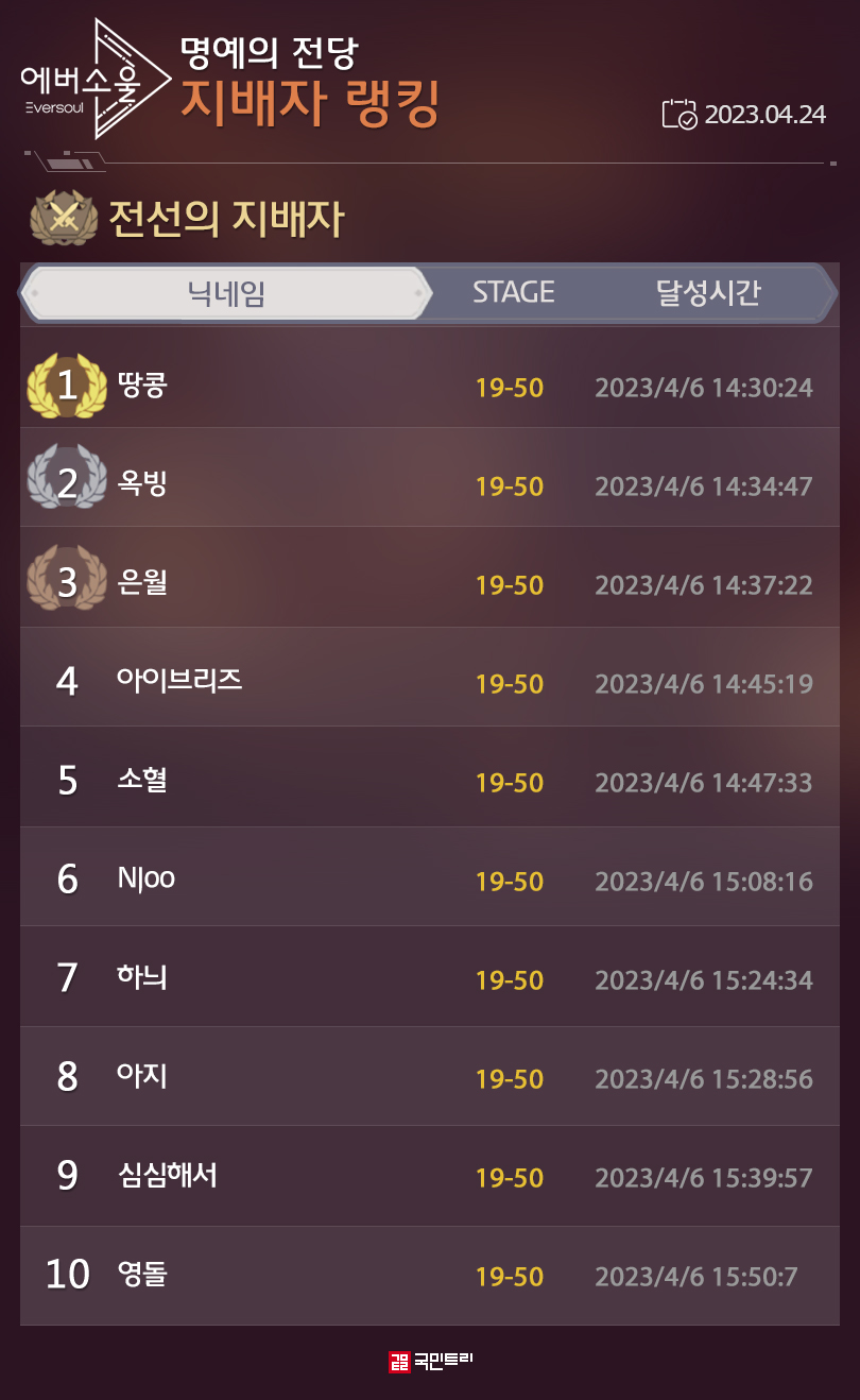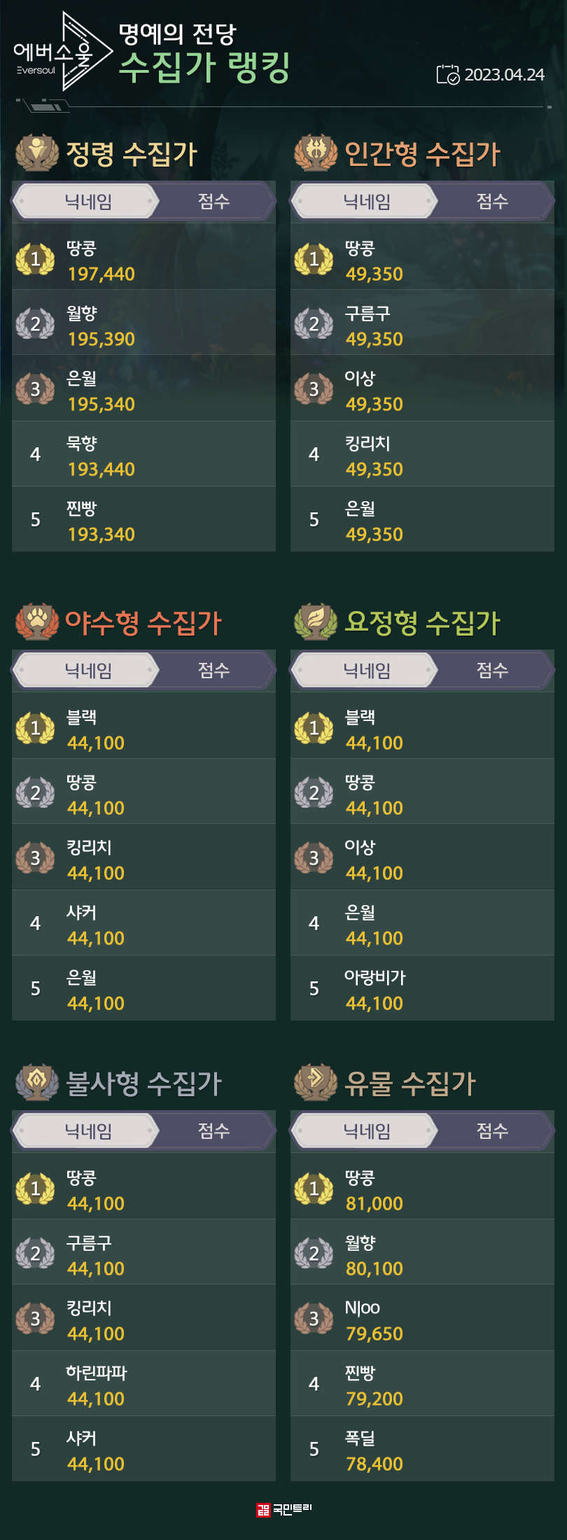 특정 콘텐츠 달성 일자를 기준으로 랭킹을 매기는 ‘명예의 전당’입니다. 5월에 신규 지역 및 게이트 추가가 예정됐죠. 현재는 폭풍전야처럼 조용한 상태입니다. 아직 상세 패치 노트가 나오지 않아 속단하기 어렵지만, 불사형 신규 정령 가넷이 추가되면 수집가 부문 랭킹에 변화가 생길 것으로 예상됩니다.