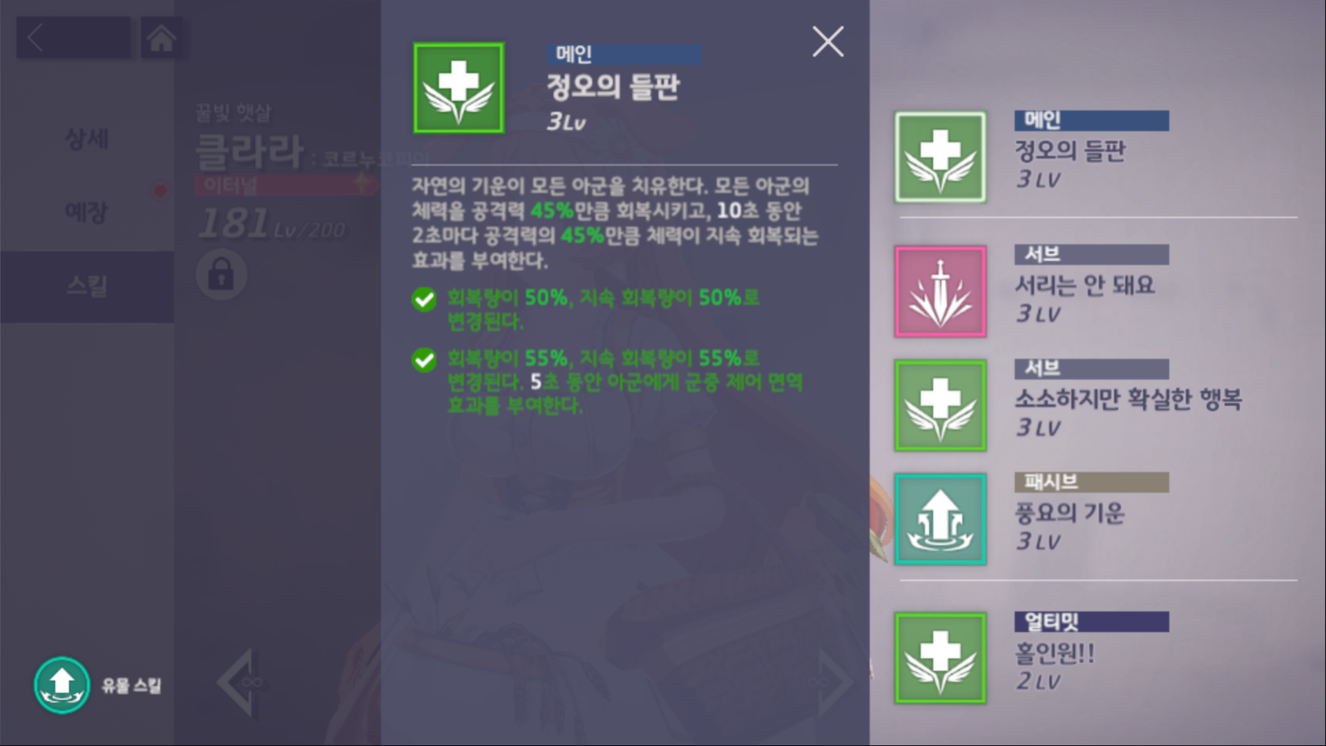 클라라 181레벨이 가능하면 메인 스킬에 5초간 군중 제어 면역 효과가 붙어서, 아야메의 매혹을 방지할 수 있습니다.