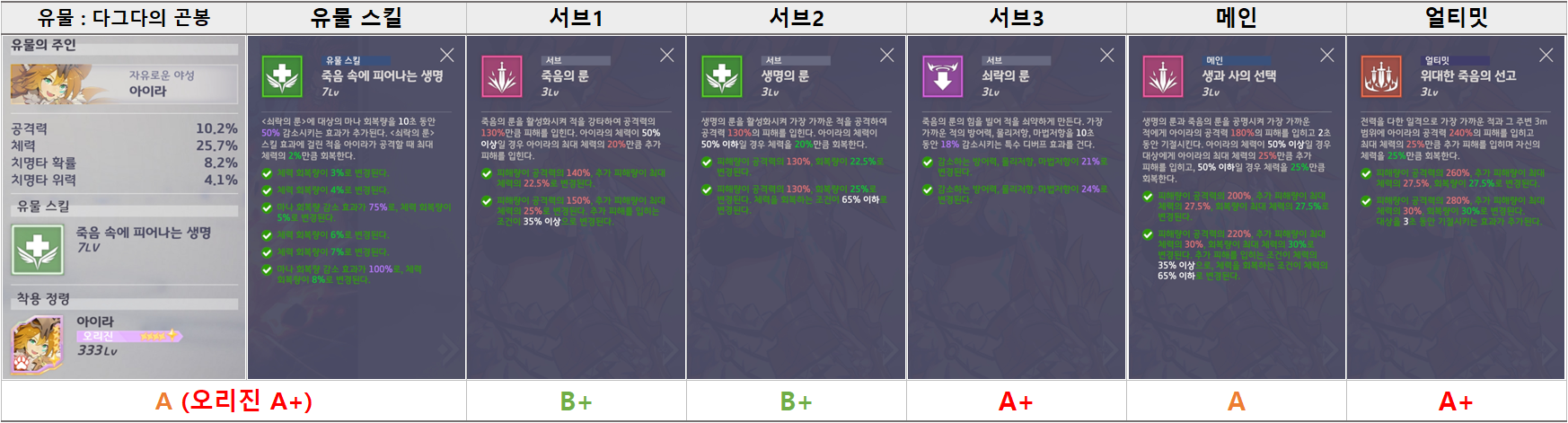 - 서브1,2가 사실 비슷한 스킬인데 데미지를 더 주냐, 자신의 체력을 회복하냐에 따라 달라집니다. 딜탱으로 써라! 하고 말하는 것처럼 서브 스킬들을 구성해 두었습니다. 다만 아이라의 사용처가 레이드에 한정된 만큼 지금까지는 자신의 체력을 회복하는 정도에 만족하는 스킬입니다. B+로 판정합니다.
