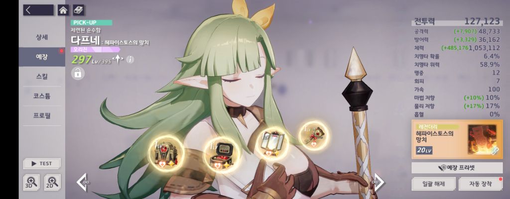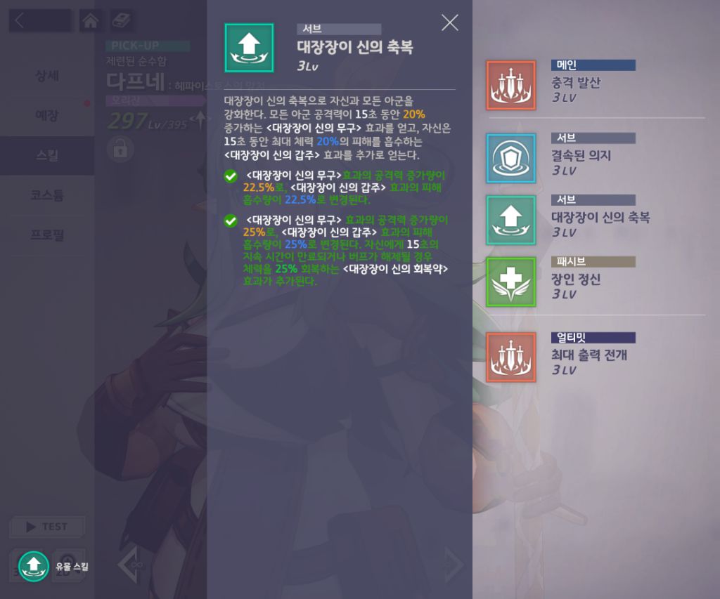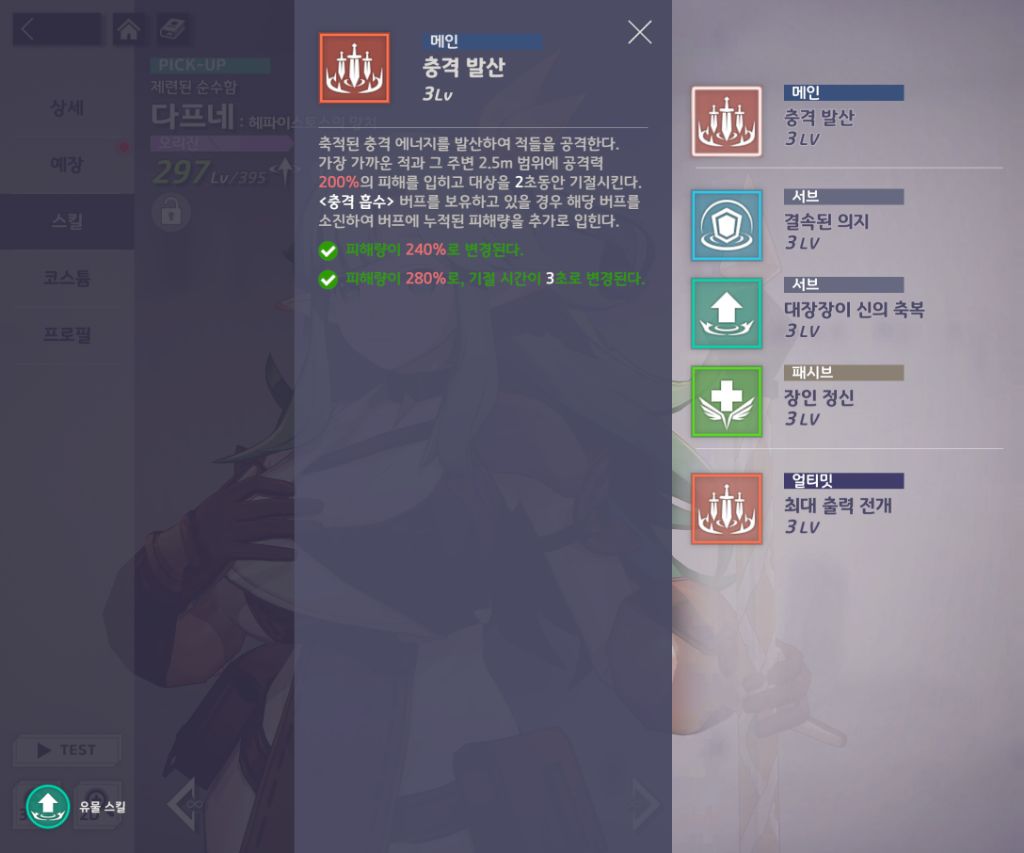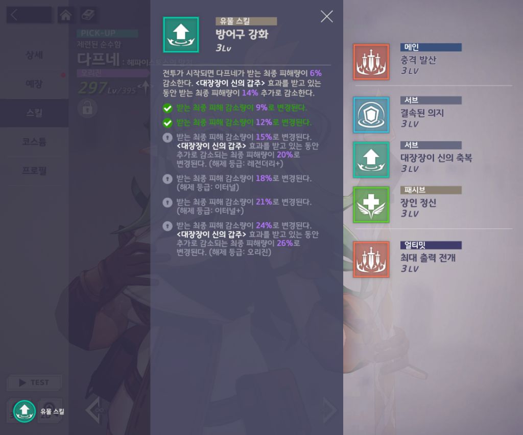 유물 고승급을 해준다고 해서 다프네의 충격흡수 버프로 인한 피해량에는 영향이 없으니 안심하고 승급해주셔도 됩니다!