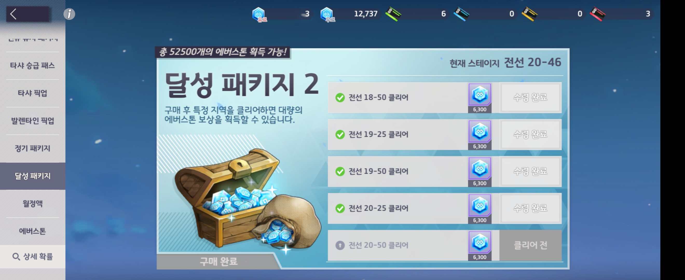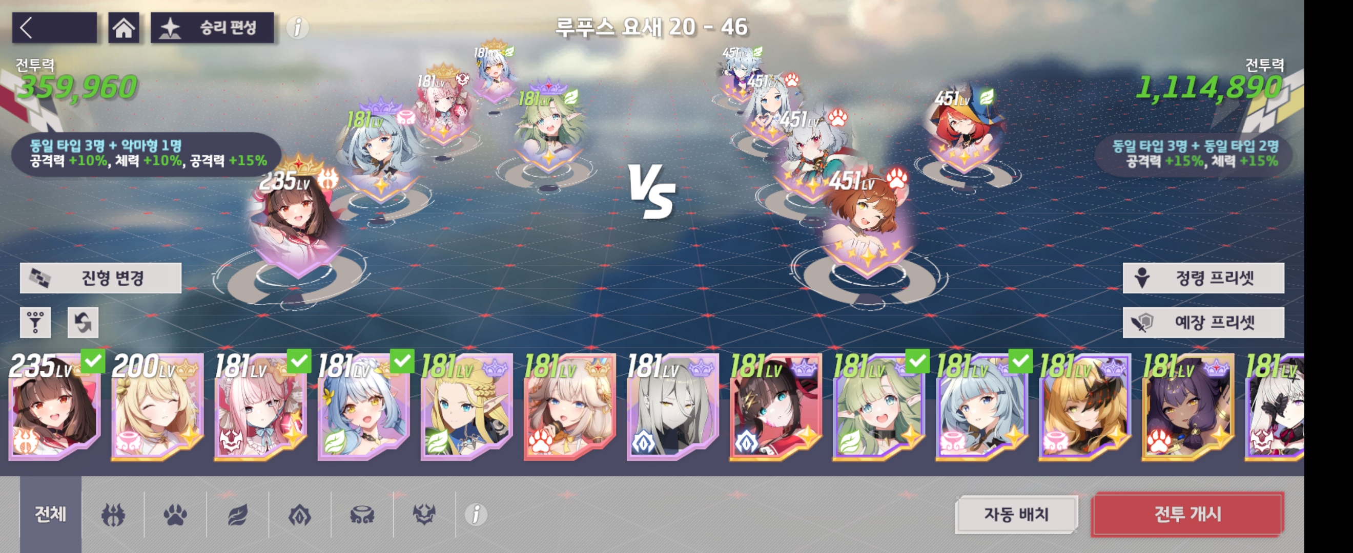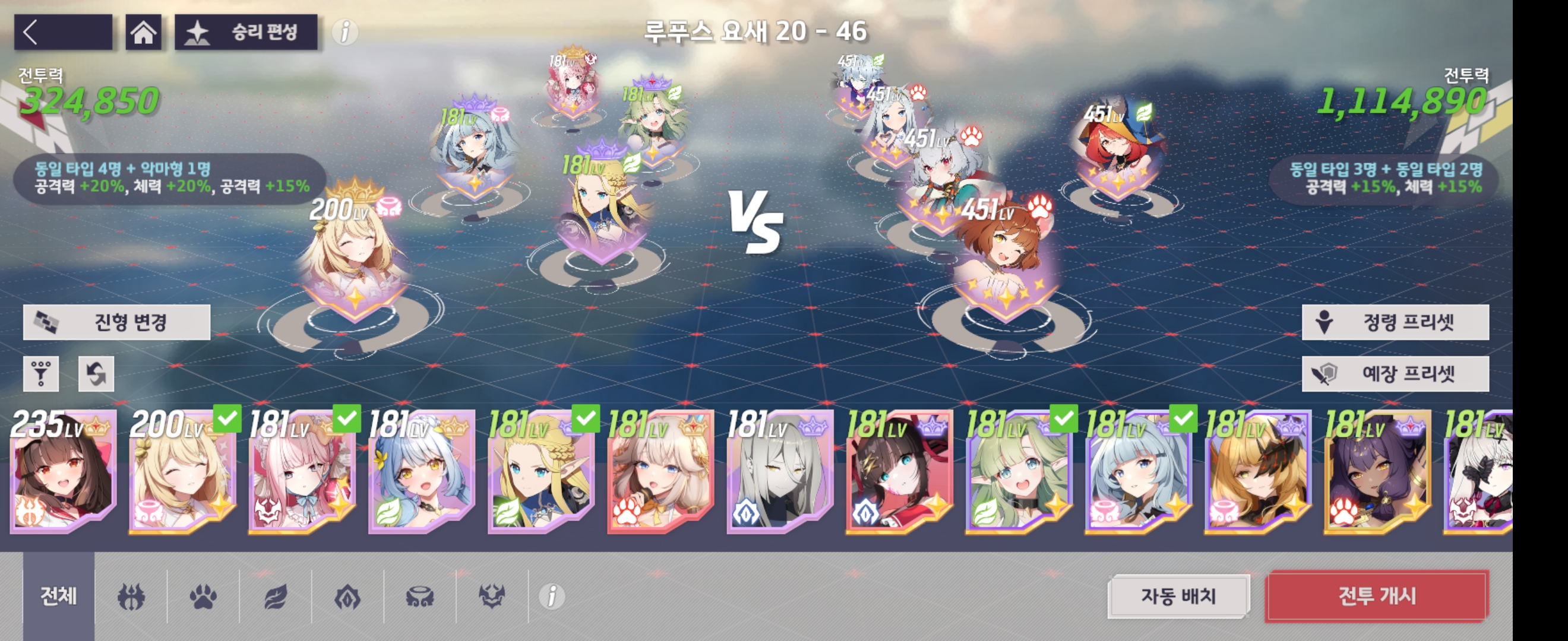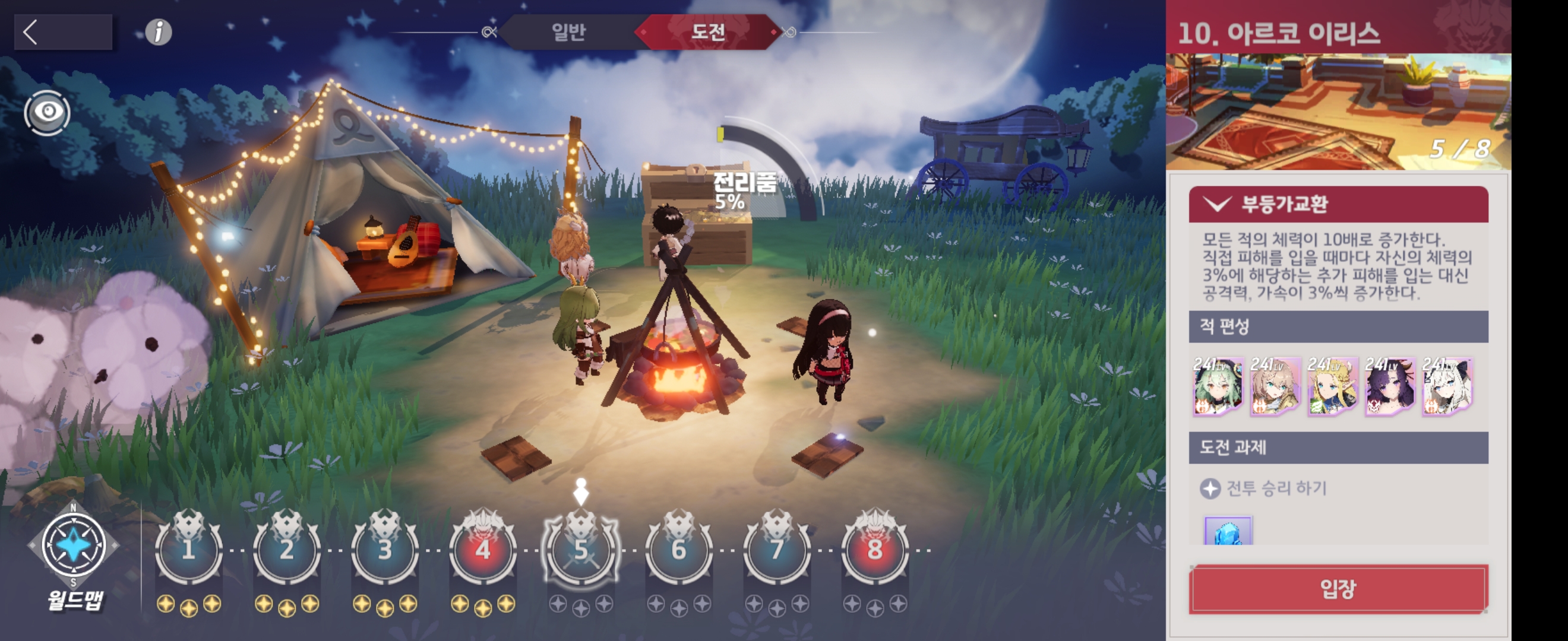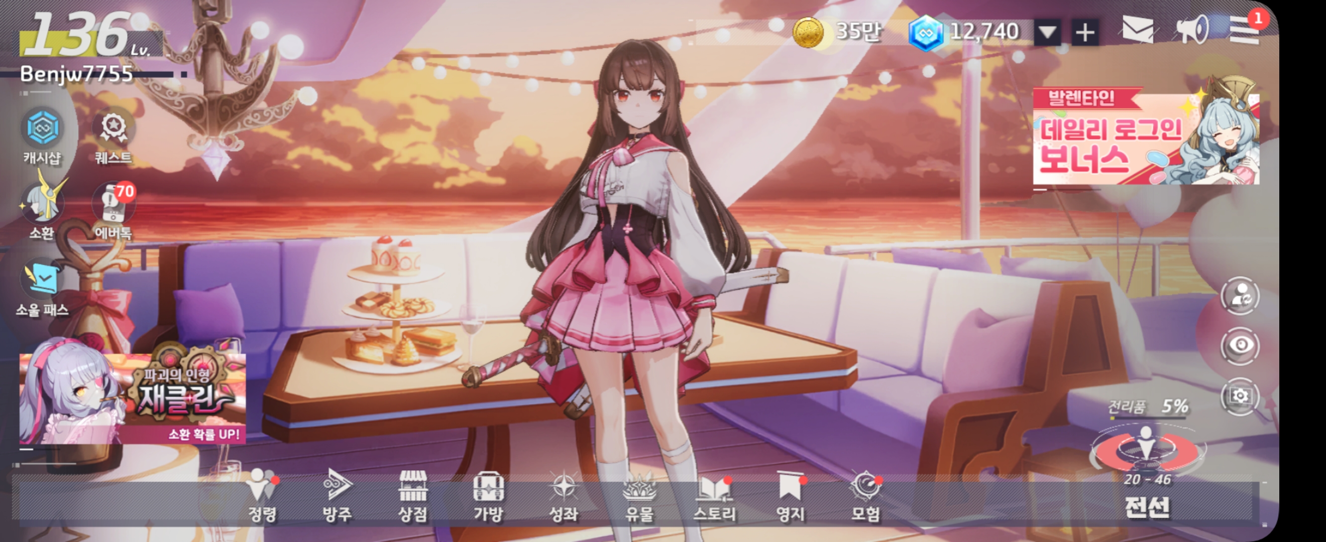 레벨은 136 전선은 20-46 까지 밀었습니다. 도전은 10-4 까지, 그리고 모든 도전을 3성으로 클리어 했고요. 더 밀 수 있는데 귀찮아서 안밀고 있습니다.