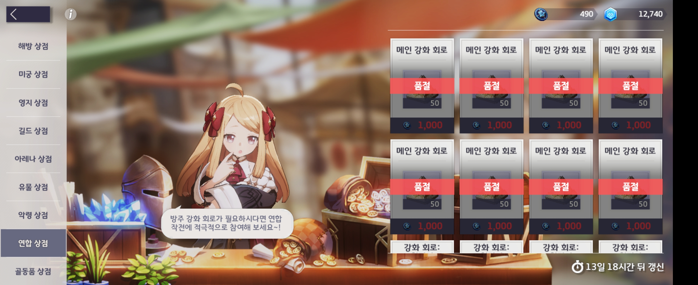 연합상점은 메인 강화 회로 위주로 사고, 다음은 스트리이커, 캐스터 같이 딜러 거를 삽니다. 그리고 밑에 재회도 있는데, 뉴비로서는 재화를 먼저 사는 게 낫다고 생각합니다.