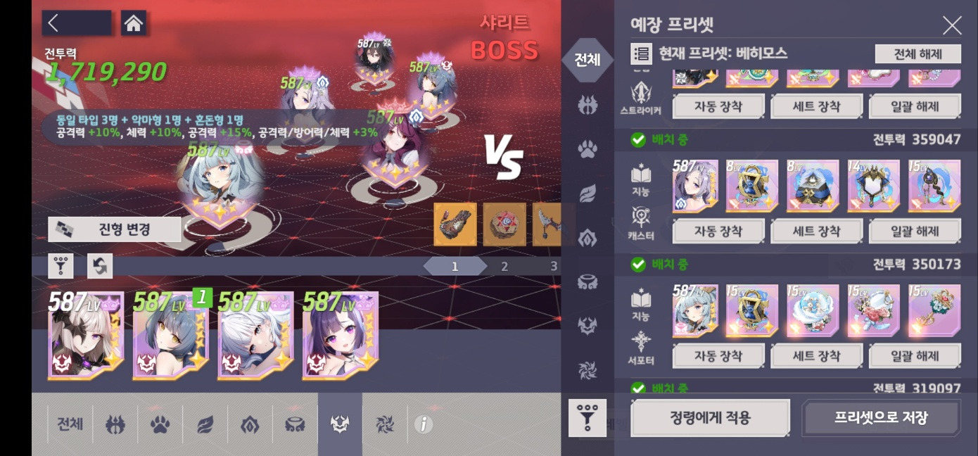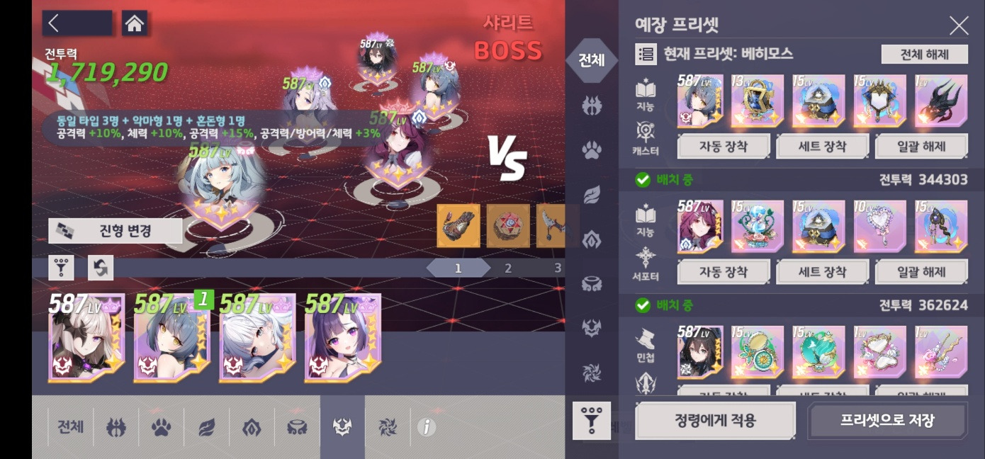 순서대로 예장 세팅, 배치 및 서포터 데미지와 영상입니다.
