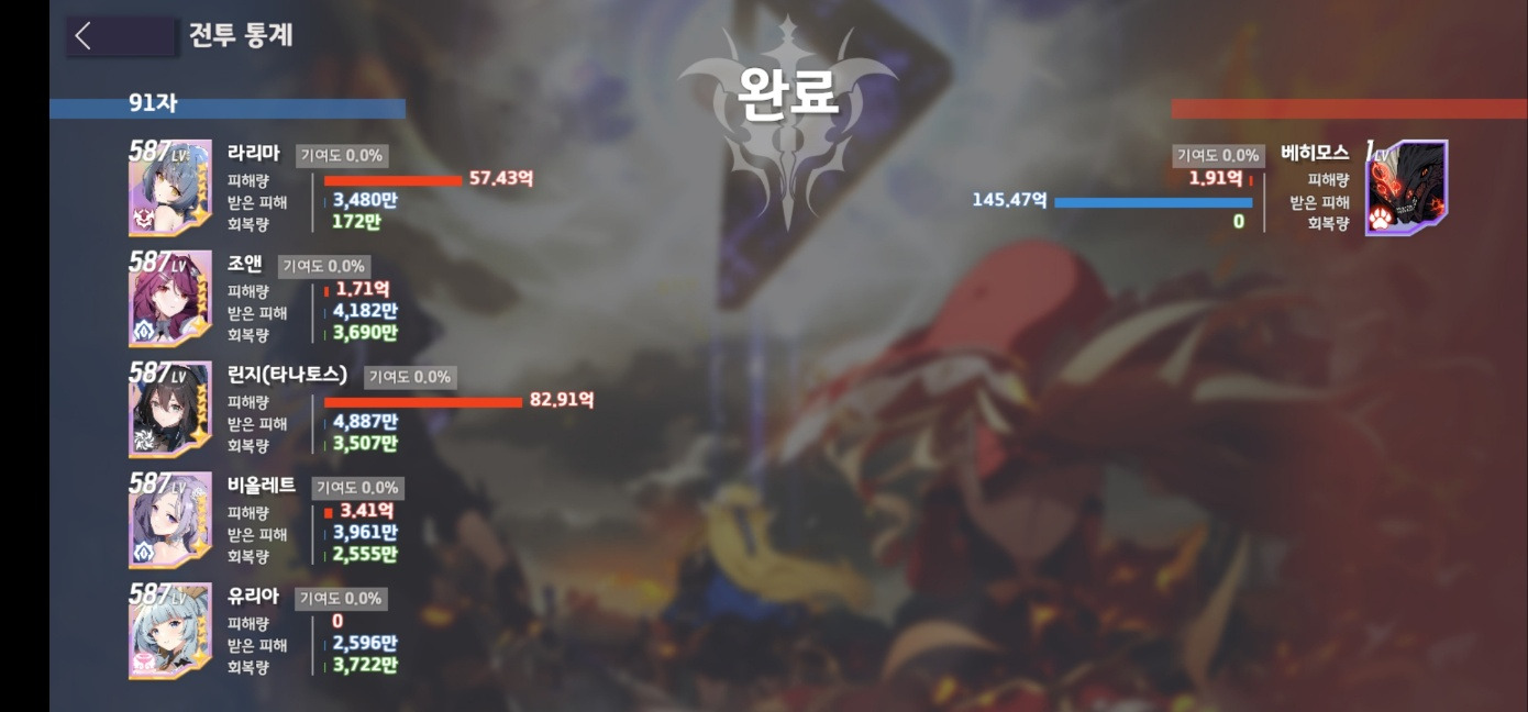 2:07 베히모스 '쿵,쿵' 다음에 죠앤 메인 이후 0.1초 정도의 텀을 두고(죠앤의 메인으로 디버프 스택이 증가할 시간을 주고) 비올 메인. 이후 '쾅(무장파괴 적용)'까지 본 후 유리아 메인