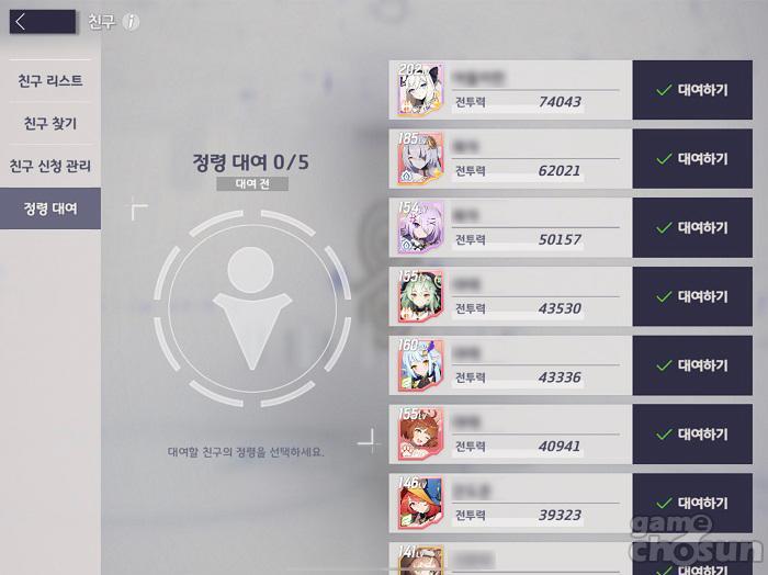 정령 대여는 말 그대로 친구의 정령을 빌려오는 것으로, 고레벨의 정령을 주요 전선 스테이지 도전 시 빌려와 한 자리를 사용하는 방법이다. 말 그대로 한 자리를 친구 정령으로 대신 하는 만큼 다섯 번째 정령에 사용될 자원을 덜어 4개 정령을 더욱 강하게 육성시키는 방법이다.