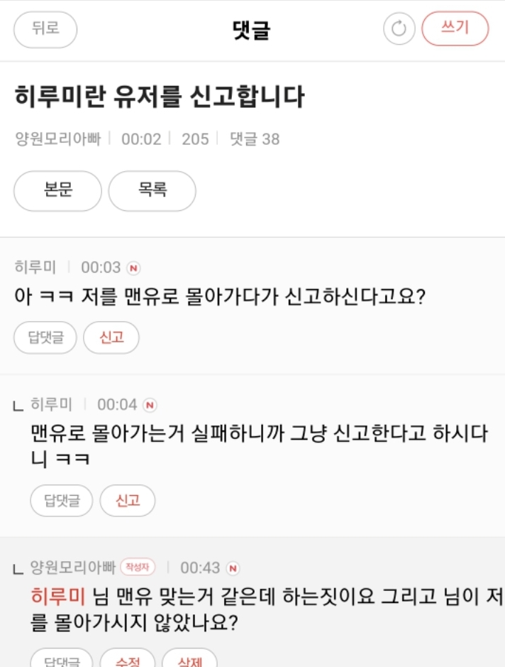 아래는 제가 그 캡쳐 사진찍은것과 함께 히루미를 신고한다는 게시글을 작성하자 히루미란 사람이 와서 쓴 댓글 입니다.(링크안에 있는 글의 댓글 중 일부이며 히루미가 이것도 글삭하고 튈시 전부 캡쳐해뒀기에 바로 올리겠습니다)