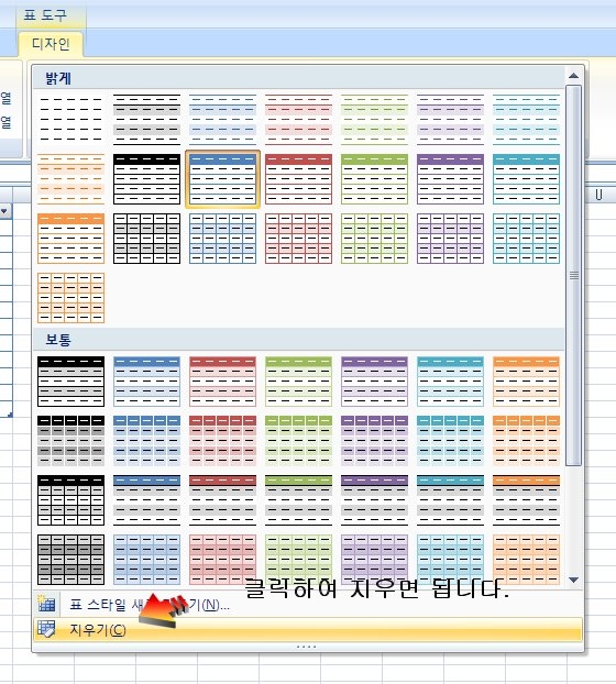 Re: 2007 표서식 삭제 하는거 알려주세요 ^-^ 작성자이기춘|작성시간08.11.28|조회수160 목록 댓글 0 글자크기 작게가 글자크기 크게가 안녕하세요? 표를 선택하면 리본메뉴에 표도구가 나타납니다. [자세히] 단추를 클릭합니다. 맨 아래에 [지우기]를 선택합니다. 그럼... Microsoft Office Excel MVP <내용출처 : 본인작성> 다음검색 현재 게시글 추가 기능 열기 북마크 공유하기 신고 센터로 신고 댓글 댓글 0 댓글쓰기 답글쓰기 댓글 리스트
