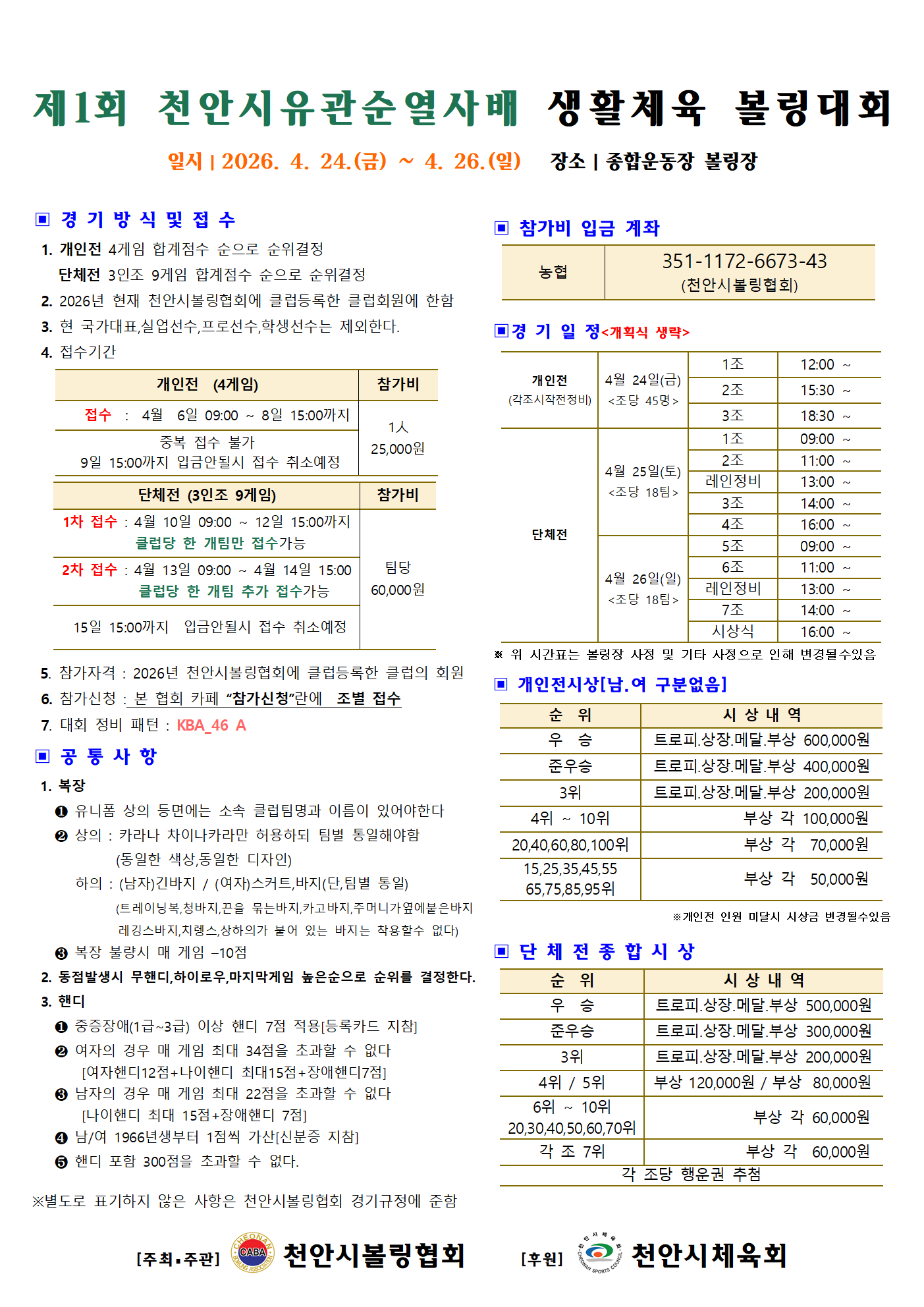 제1회 천안시유관순열사배 생활체육 볼링대회 작성자이형주|작성시간26.03.31|조회수861 목록 댓글 1 글자크기 작게가 글자크기 크게가 다음검색 현재 게시글 추가 기능 열기 북마크 공유하기 신고 센터로 신고 댓글 댓글 1 댓글쓰기 답글쓰기 댓글 리스트 작성자이형주 작성자 본인 여부 작성자 | 작성시간 26.04.01 개회식 없습니다개인전도 상의 유니폼은 클럽명과 이름이 등면에명시되어 있어야함 댓글 전체보기