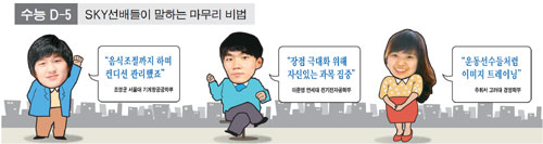 수능을 5일 앞두고 조영균 씨(20ㆍ서울대 기계항공공학부 1년), 추휘서 씨(21ㆍ고려대 경영학부 1년), 이준영 씨(22ㆍ연세대 전기전자공학부 2년) 등 세 선배는 "무모하게 새로운 문제에 도전하지 말고 하던 내용을 복습하고 기출문제에 집중하라"고 입을 모았다.