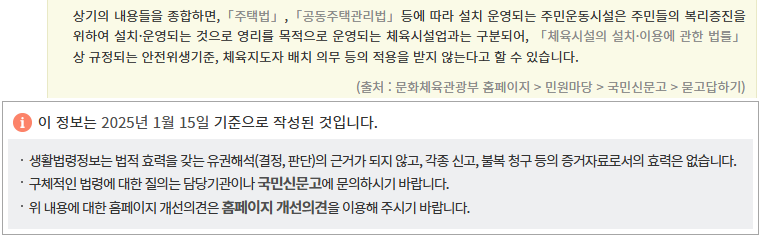 ■아파트 커뮤니티센터(헬스장, 골프장 등) 복리증진을 위해 입주민만 관리비로 받고 사용 = 체육지도자(스포츠지도사 등)배치 의무 없음 (단, 외부인개방으로 영리목적이면 배치의무가 생기며 국세청, 구청 등 관련기관법이 복잡해 짐)