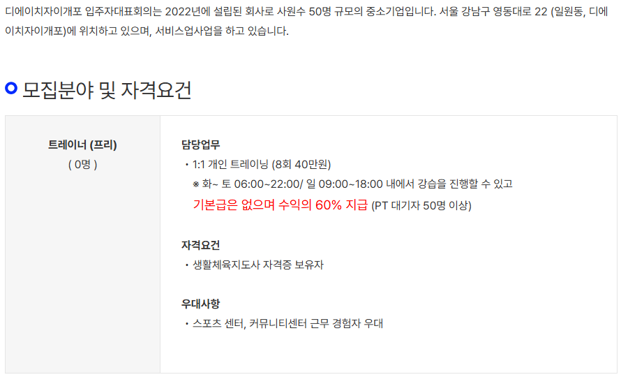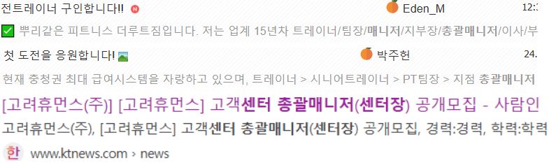 | ■기피해야할 회사(인력에 한계가 있는 회사들) 체육인이 커뮤니티총괄(팀장,실장,총괄매니저,센터장 등)인 회사 국가자격증 중에 생활스포츠지도사1급(=생활체육지도자2급), 생활스포츠지도사2급(=생활체육지도자3급) , 컴퓨터활용능력2급, 사무자동화산업기사 정도가 총괄인 회사 |