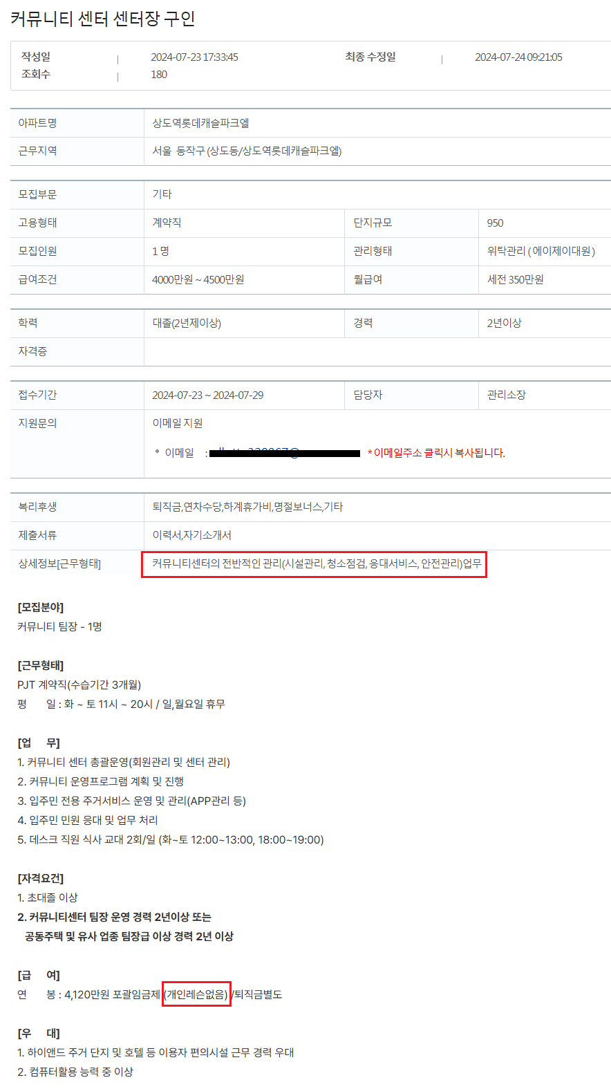▶ 중간관리자(과장,대리,주임)=250~350만원(총괄관리자 대체 예비 인력으로 안내는 기본이고 청소관리, 시설수리 등 추가업무수행)