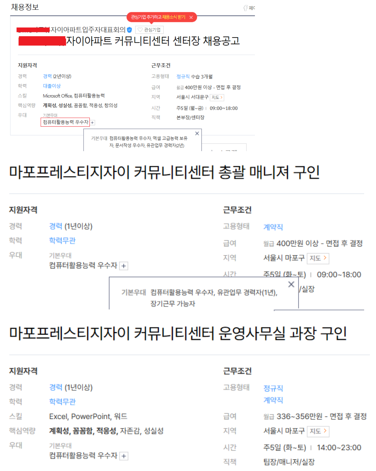 아파트 커뮤니티센터 센터장(팀장,총괄매니저,실장)을 컴퓨터활용능력1급으로 꾸려두면 사무자격증구직난에서 어느정도 해방될 수 있다. 아파트는 몇달하다 관둘 정도로 근속기간이 대부분 짧아 사무자격증들이 오려 들지 않는다.