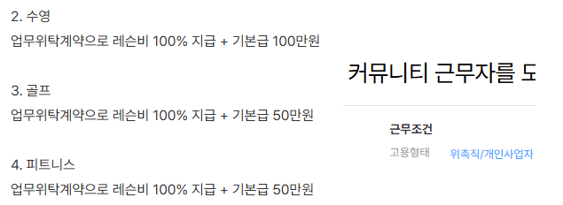 참고로 강사(헬스,수영,골프 등)들을 잡일시키면 싹다 나가려 들고 반발이 심한 경우가 많다. 강사들은 강의하러 온것 이지 잡부로 온게 아니라는 개념이 강하다. 위에처럼 레슨비90%~100%지급 프리랜서(위촉직,개인사업자)로 강사(헬스,수영,골프 등)을 뽑고 잡일 안시키는 방법이 좋다. 강사들을 월급제(정직원+레슨비30~50%)로 뽑아서 잡일시켜 봐야 강의레슨하기 바쁘다는 핑계로 어차피 잡일 안한다. 강사들은 엘리트 체육인들도 많이와서 잡일 시키면 반발심이 강하다는 것을 인지하고 운영하면 됩니다.